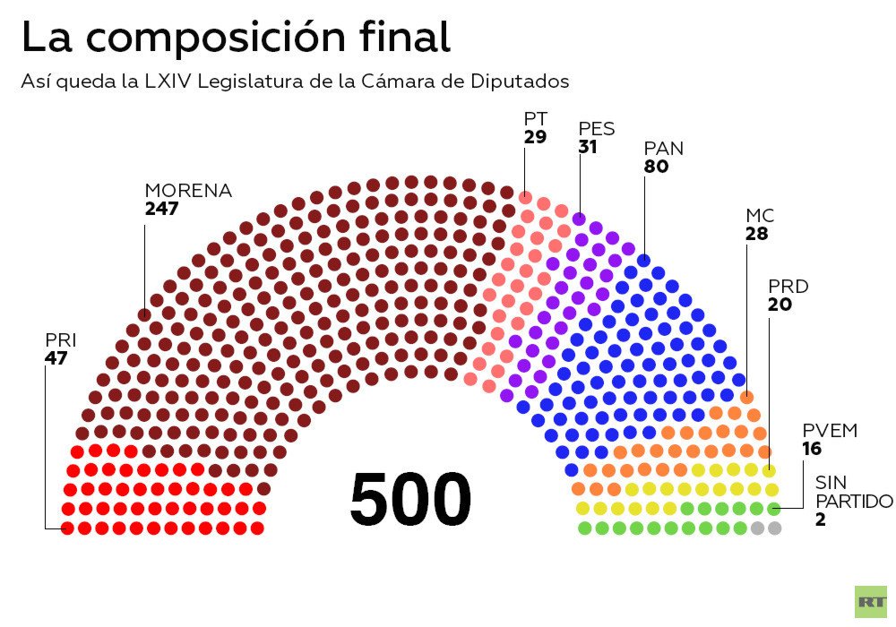 En la Cámara de Diputados, conformada por 500 legisladores, la bancada de Morena para la LXIV Legislatura quedó integrada por 247 diputados, que junto a sus aliados PT, con 29, y PES, con 31, logra un total de 307 legisladores.