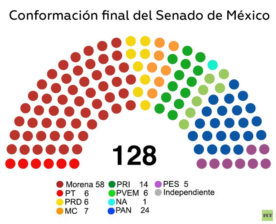 De 128 senadores, Morena contará con 58 legisladores, más 6 de su aliado PT y 5 del PES, para un total de 69 senadores afines al próximo presidente electo.