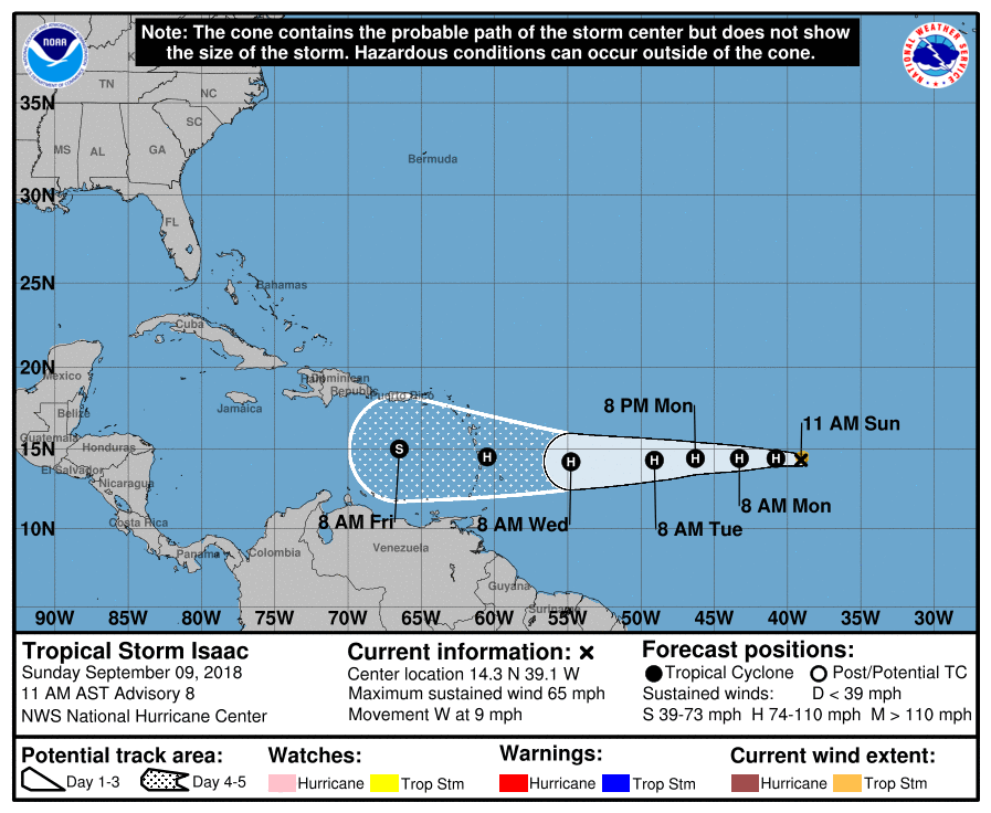 Además del huracán Florence que se dirige hacia Estados Unidos, en el océano Atlántico también se formó la tormenta tropical Isaac, que en estos momentos se desplaza con vientos máximos sostenidos de 105 kilómetros por hora en dirección a Venezuela, Puerto Rico y la República Dominicana, de acuerdo con datos del Centro Nacional de Huracanes de EE.UU. (NHC, por sus siglas en inglés).