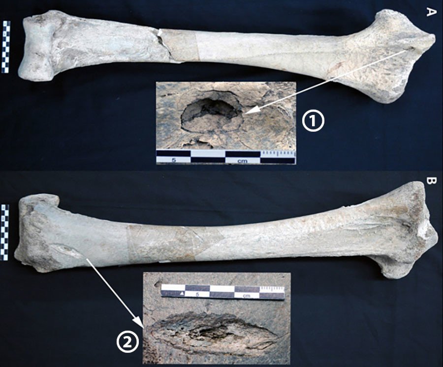 El análisis de dos huesos de ave elefante, una de las especies endémicas de Madagascar que estuvo extinta entre los siglos XVII y XVIII, indicaron que también vivió hace 10.500 años. Sin embargo, estos especialistas se sorprendieron de que una tibia tenía marcas de corte realizadas con una gran herramienta afilada.