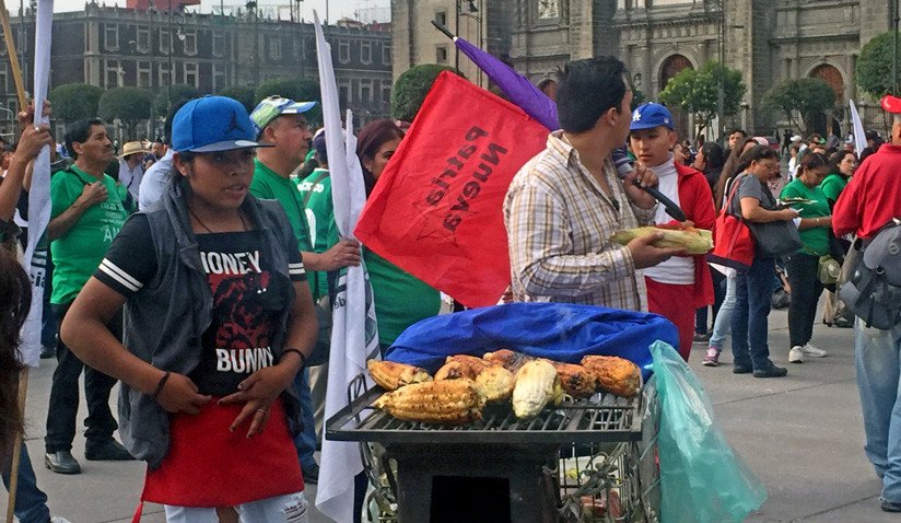 En las esquinas de calles transitadas del zócalo capitalino es común ver a señoras como Angelina Romo, que desde Toluca, estado de México (centro), hacen dos horas para llegar y vender las típicas 'doradas', una especie de plato crujiente al que le ponen nopales, queso y frijoles, otro grano básico en México.
