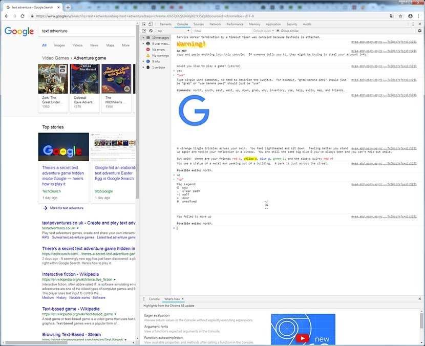 El minijuego consiste en completar el logo de Google buscando las letras que faltan. Para acceder a él, hay que escribir 'text adventure' en google.com (solo funciona en la web en inglés) y tras la aparición de los resultados de búsqueda, pulsar F12 en Windows o CMD+ALT+I en Mac. Luego, a la derecha habrá que elegir 'Consola' y teclear 'yes' para empezar a jugar.