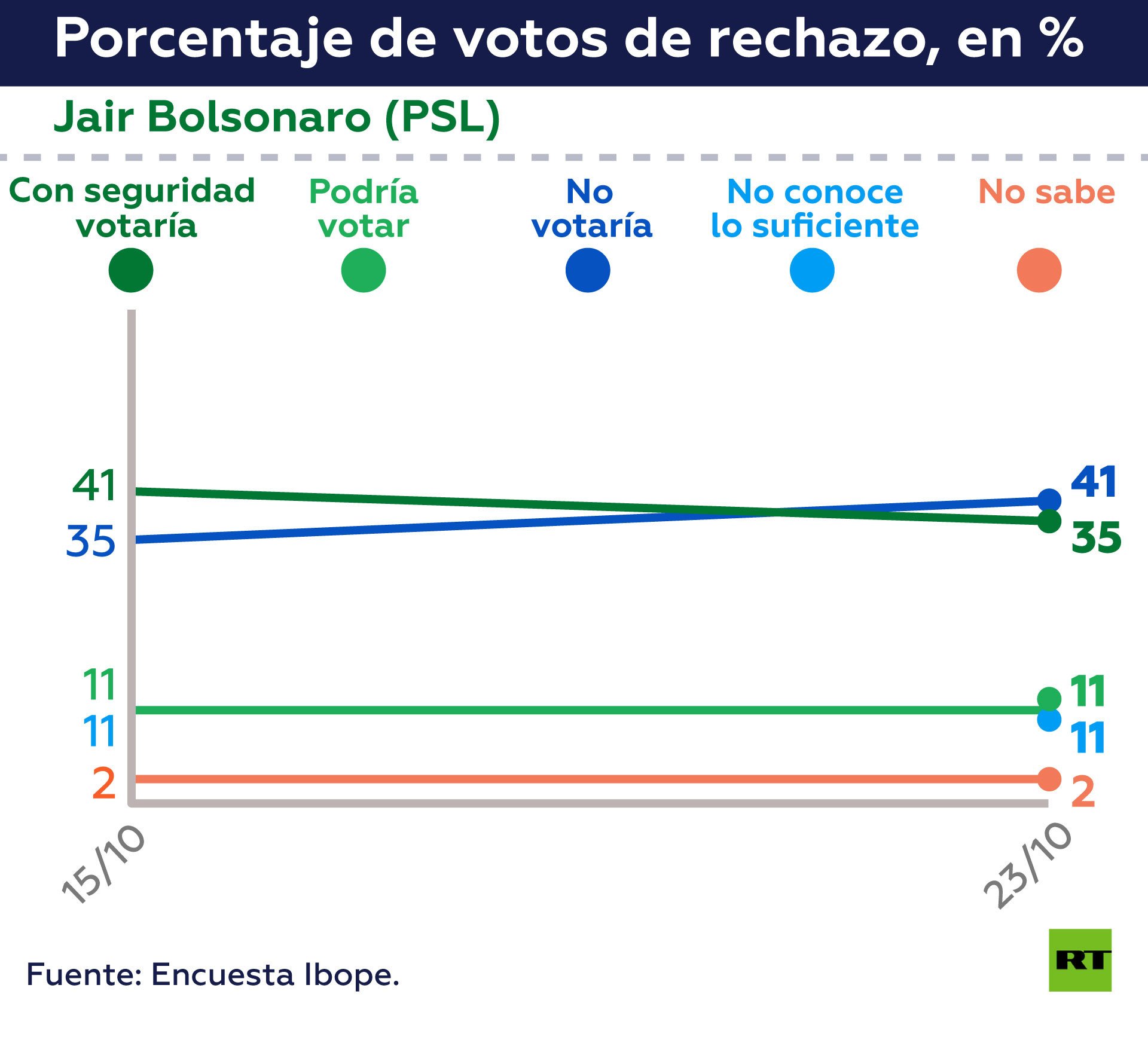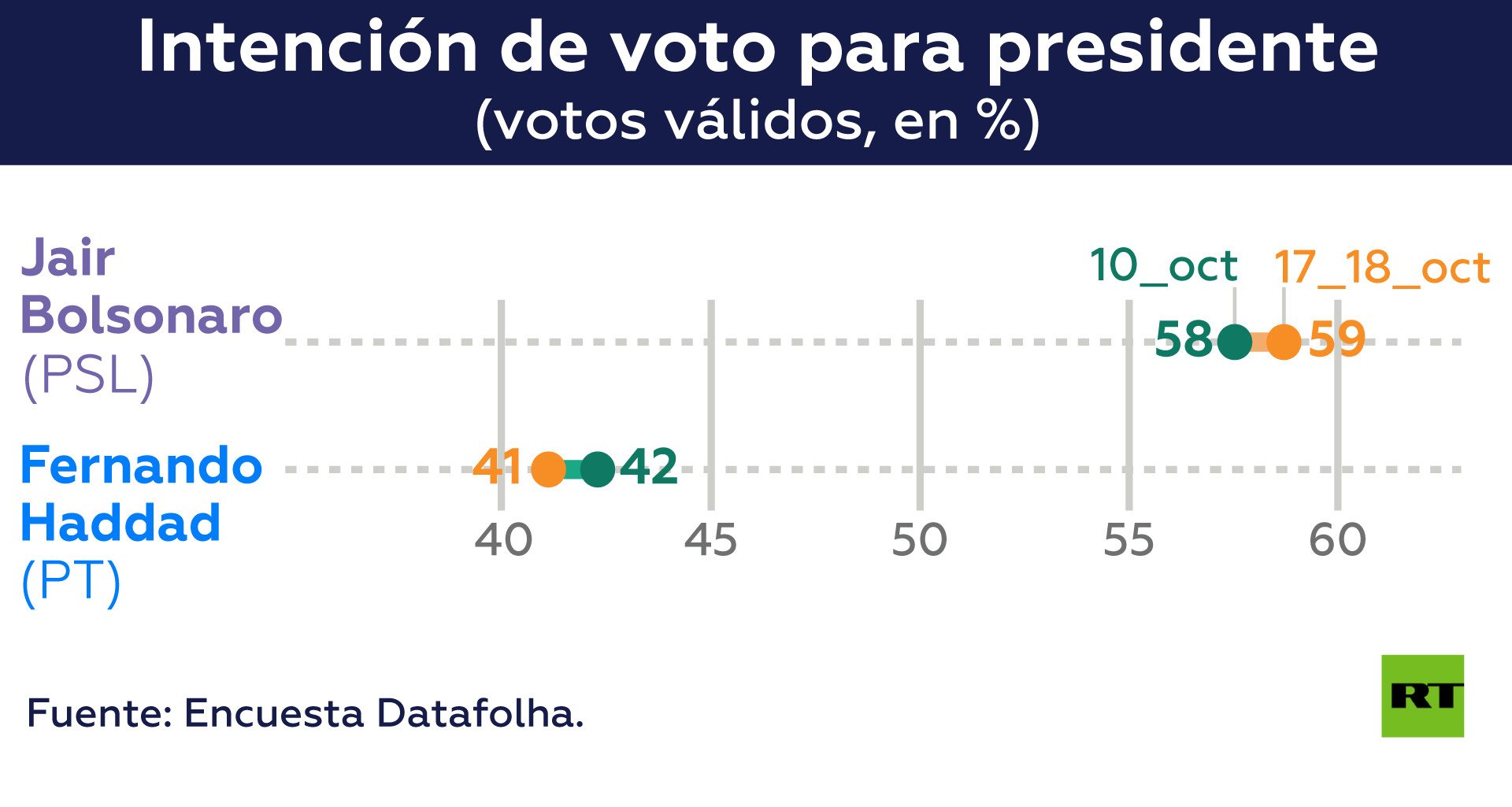 En un ambiente electoral altamente polarizado, Bolsonaro llega a la segunda vuelta como claro favorito, tras haber obtenido 48% de las boletas en la primera ronda y con una intención de voto que, según el más reciente sondeo de Datafolha, se ubica en 57%.