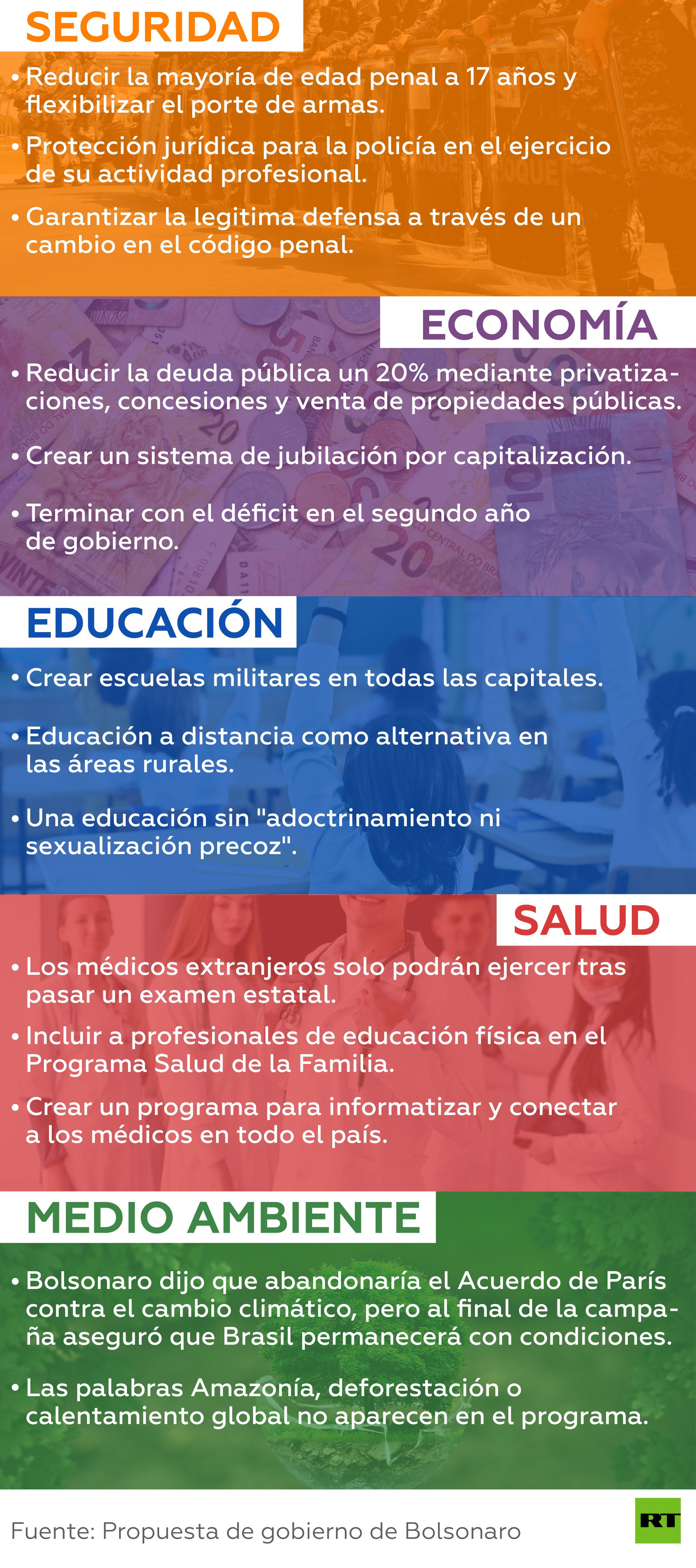 Además, en materia educativa, el ultraderechista quiere crear escuelas militares en todas las capitales, modificar los planes de estudio y llevar a cabo una educación "sin adoctrinamiento ni sexualización precoz". Bolsonaro desea nombrar a un militar en la cartera de Educación, pero todavía se desconoce quién será.
