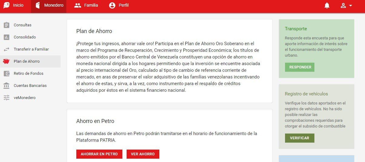 Una vez dentro del sistema Patria, en la opción 'Monedero' aparece una subcategoría llamada 'Plan de Ahorro', donde se encuentra otra titulada 'Ahorro en Petro'. Allí debe hacer clic en el enlace para ir al paso siguiente.