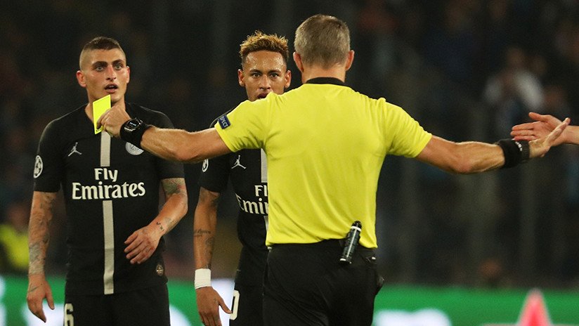 El astro futbolístico brasileño vio una tarjeta amarilla en el minuto 91 por unas supuestas protestas a propósito de que los jugadores del Nápoles no estaban a la distancia correcta mientras él se disponía a lanzar un tiro libre.
