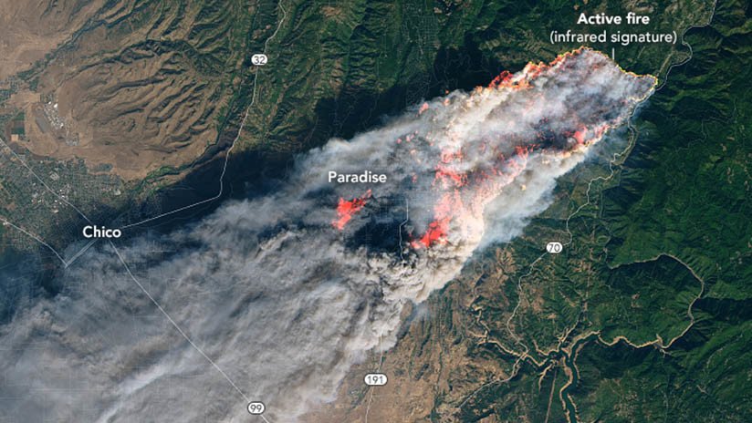 La NASA difundió en Twitter imágenes satelitales del gran incendio 'Camp Fire' que desde este jueves causa estragos en el norte de California, Estados Unidos.