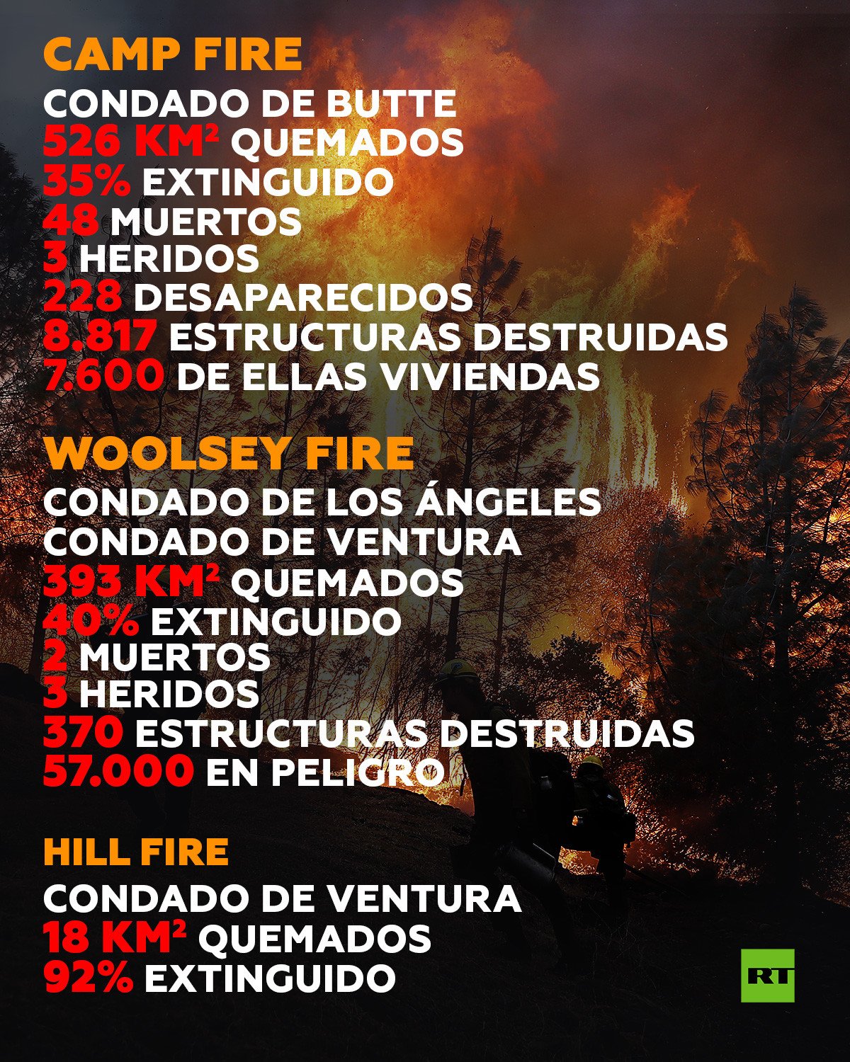 Medio centenar de personas han muerto por los devastadores incendios forestales que continúan asolando California. Más de doscientos personas se encuentran desaparecidas y miles de residentes han perdido sus viviendas, arrasadas por el fuego. Los incendios ya se han convertido en los más mortíferos en la historia de este estado.