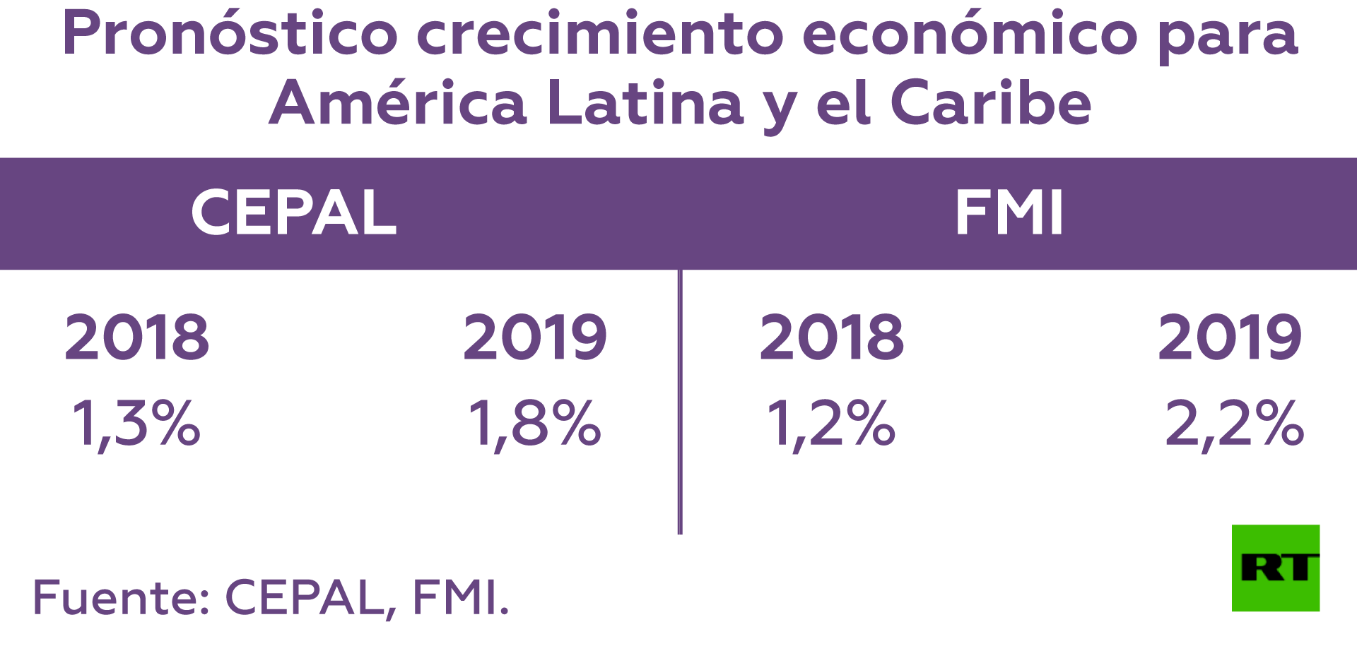 De acuerdo al FMI, las regiones de América Latina y el Caribe tendrán un crecimiento económico de 1,2 % al cierre del año, 0,8 % menos que lo pronosticado en abril y 0,4 % por debajo de los anunciado en julio. Según este organismo, la contracción se debe a las situaciones actuales de Argentina y Venezuela, así como el crecimiento desacelerado en Brasil. No obstante, para 2019, el ente dice que habrá un alza de 2,2 %.