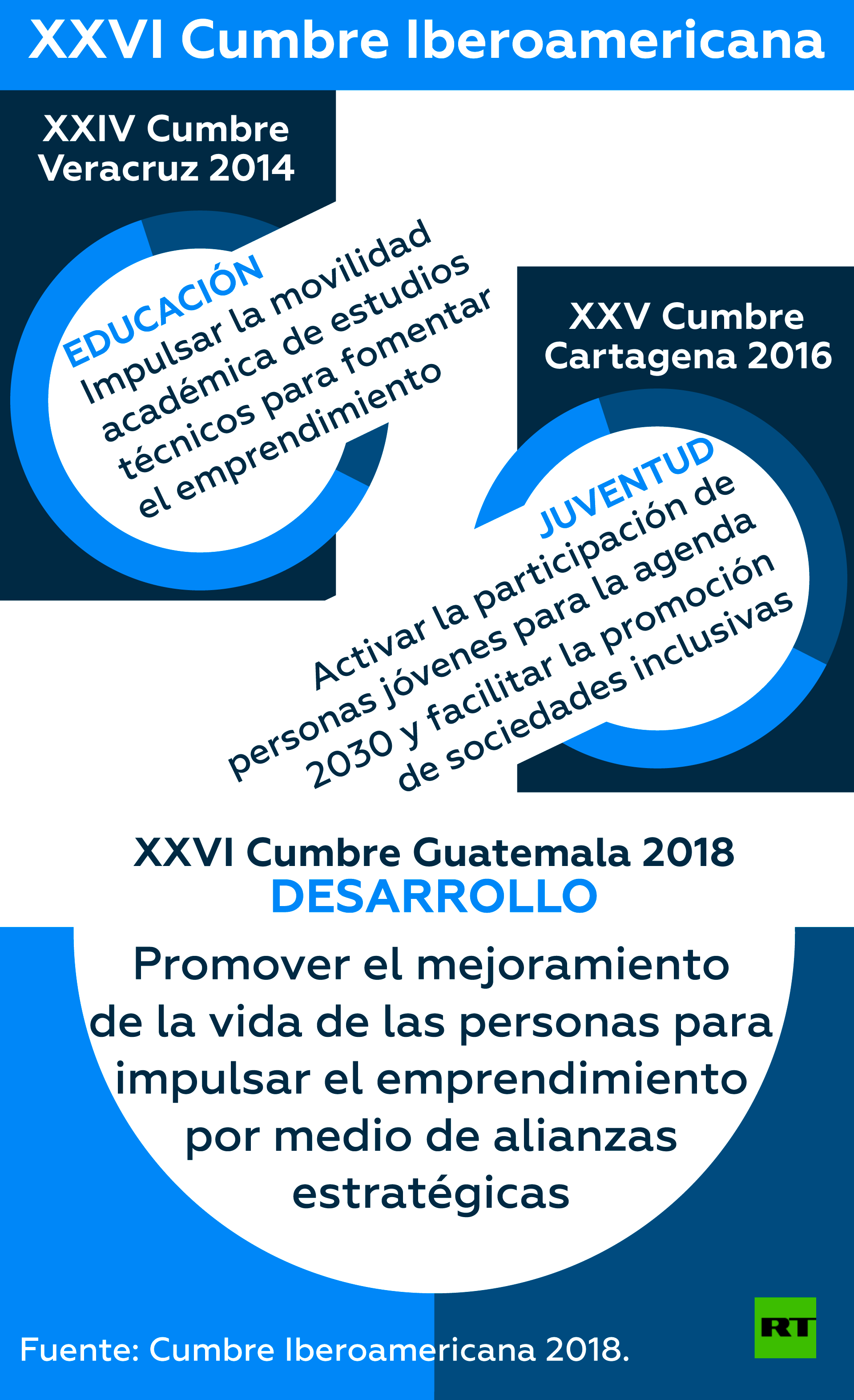 Tomando en cuenta las citas anteriores, celebradas en 2014 en Veracruz [México] y en 2016 en Cartagena de Indias [Colombia], donde se abordaron temas como "educación" y "juventud", en la cita guatemalteca se hará énfasis en el "desarrollo" de Iberoamérica, un espacio geográfico que ocupan alrededor de 650 millones de personas, bajo el compromiso del "desarrollo sostenible".