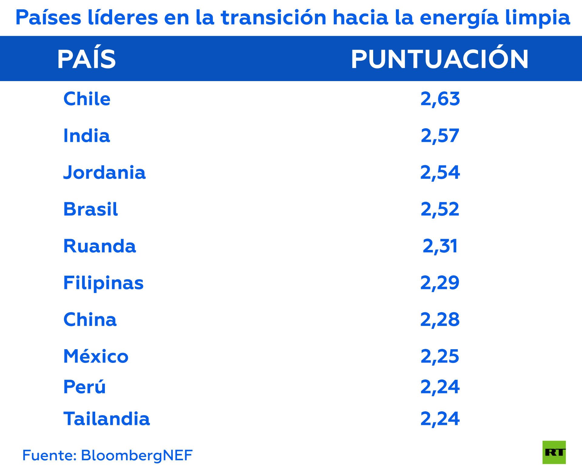 El segundo lugar es para India, "sede de las mayores y más competitivas subastas de energía renovable del mundo". Nueva Deli ha incrementado las capacidades subastadas un 68 % desde 2017 y sus inversiones, principalmente en proyectos de energía solar, contabilizaron 7.400 millones de dólares en la primera mitad de este año.