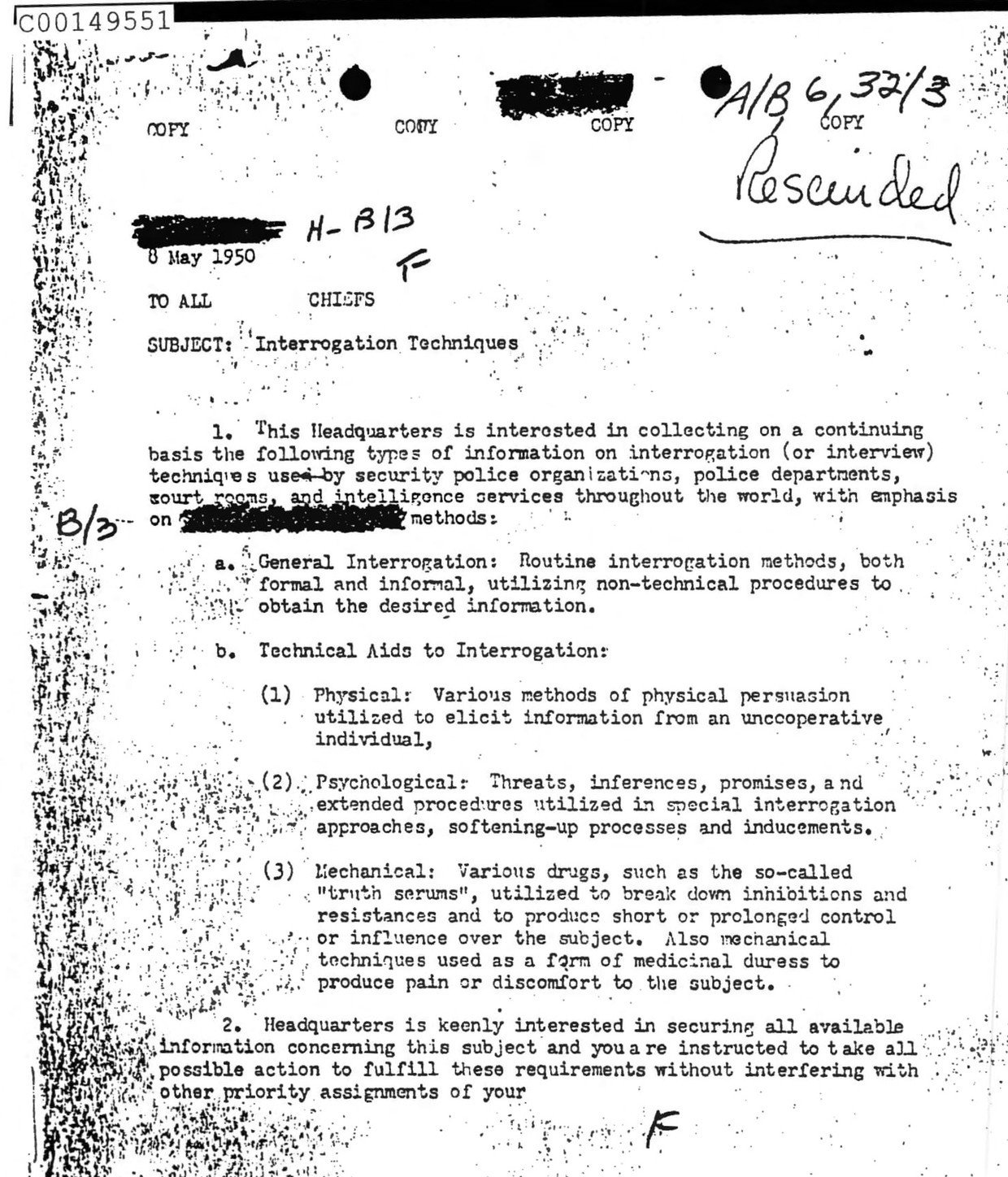Uno de estos archivos es un plan para probar medicamentos experimentales destinados a inducir el cumplimiento y la pasividad de los reclusos en los hospitales de la prisión y luego someterlos a "interrogatorios". Lo que en la información desclasificada se describe como "interrogatorios", sin embargo, podían ser en realidad métodos para conseguir información mediante la tortura "física", "psicológica" y "mecánica" para inducir el cumplimiento en "individuos no cooperativos".