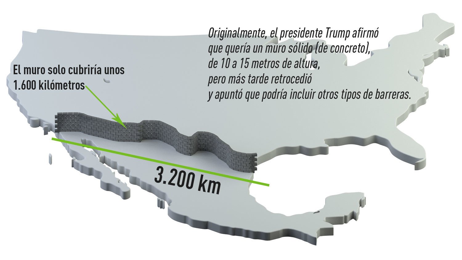 - La frontera entre EE.UU. y México, que pasa por el territorio de los estados de California, Arizona, Nuevo México y Texas, se extiende por alrededor de 3.200 km desde el océano Pacífico hasta el golfo de México, pero el muro no necesita ser tan largo gracias a la preponderancia de fronteras naturales como el río Grande. El propio presidente aclaró que el muro solo cubriría unos 1.600 kilómetros debido a estas "barreras naturales".