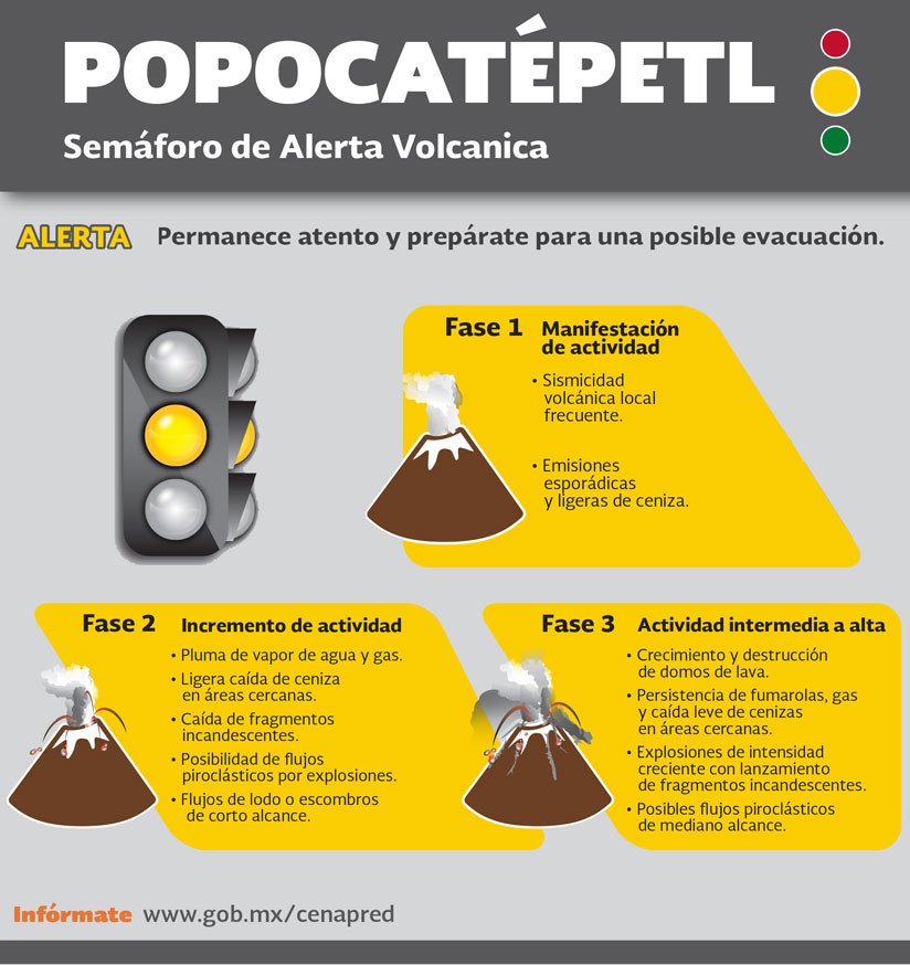 De acuerdo con el semáforo de alerta volcánica, el Popocatépetl se encuentra en Amarillo Fase 2. El Centro Nacional de Prevención de Desastres (CENAPRED) "exhorta a no acercarse al volcán y sobre todo al cráter, por el peligro que implica la caída de fragmentos balísticos y en caso de lluvias fuertes alejarse de los fondos de barrancas por el peligro de deslaves y flujos de lodo".