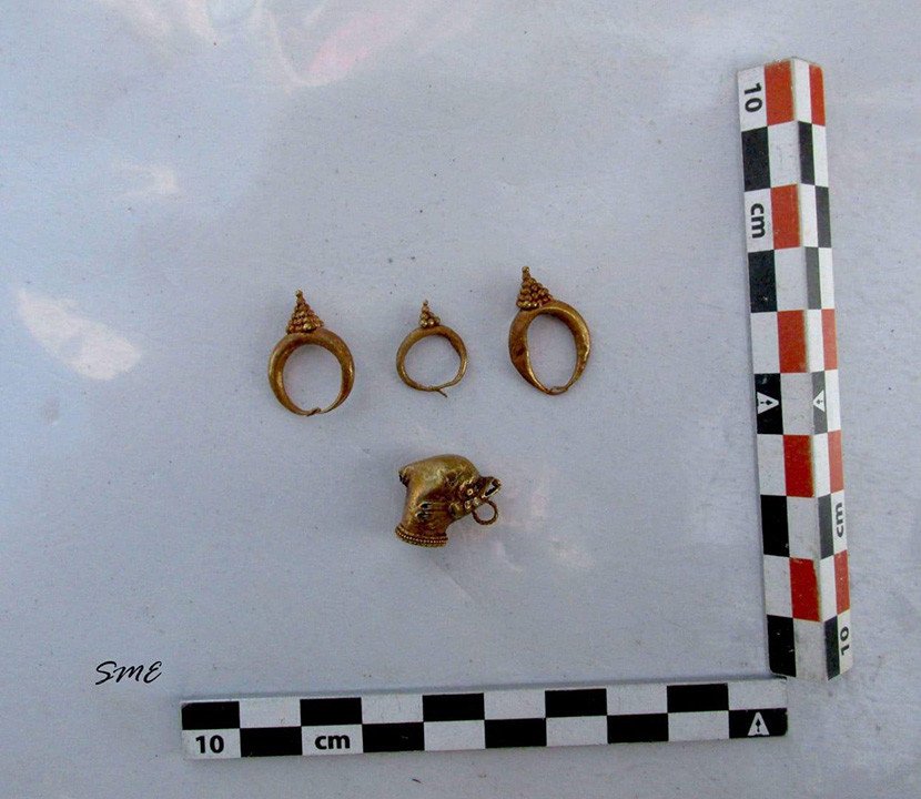 Aparte de este hallazgo, la misión arqueológica encontró en la zona los restos de más de 700 vasijas de cerámica, amuletos de diferentes formas y cinco anillos de oro. Tres de ellos llevan un racimo de uvas, el símbolo del dios griego Dionisio y del romano Baco.