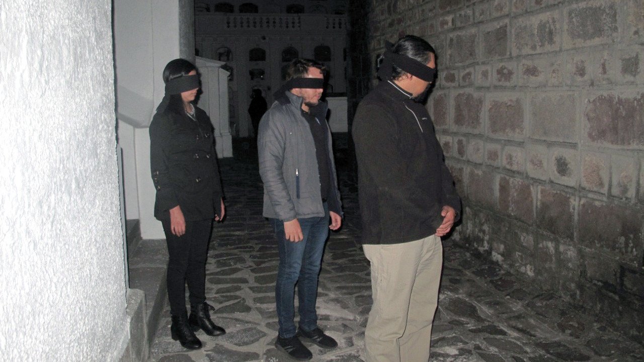 A las 18:30 la espera acabó. Alexandra Ortega, coordinadora de Quito Post Mortem, vestida de negro, con manta en la cabeza, se acercó a los asistentes. Recordó, como decía la convocatoria en redes sociales, que se trataba de un recorrido "a ciegas". "Están a punto de entrar a un lugar al que agradecemos su respeto, quien se tome a burla lo que haremos, será sacado", advirtió.