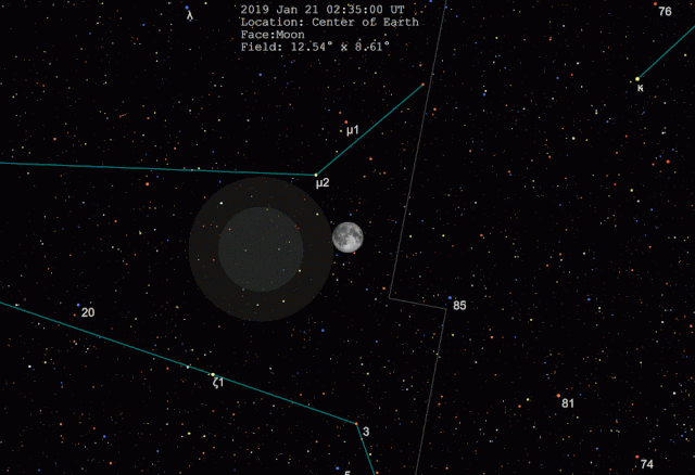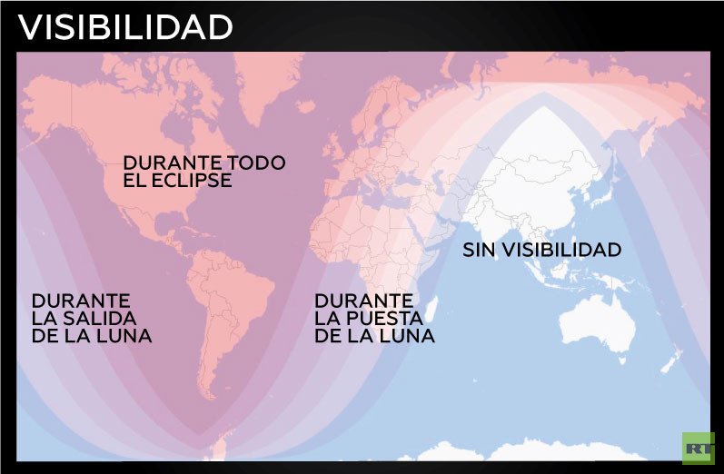 El apogeo del eclipse total se producirá alrededor de las 5:12 UTC del 21 de enero. Este fenómeno durará 62 minutos y se verá en su totalidad desde el continente americano, así como desde las regiones occidentales de Europa y en el noroeste de África.