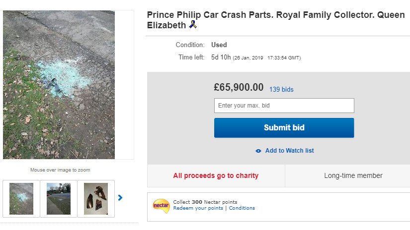 Tras el accidente de tránsito protagonizado el pasado jueves por el príncipe Felipe, esposo de la reina Isabel II, una persona ha recogido algunas piezas, aparentemente del vehículo Land Rover del duque de Edimburgo, encontradas en el condado de Norfolken (Reino Unido), y ha decidido subastarlas este lunes en Internet a través de la página de eBay.