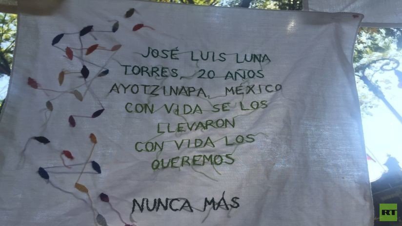 "Con vida se los llevaron, con vida los queremos", dice el bordado de 'Poli', dedicado al estudiante Jorge Antonio Tizapa Legideño, desaparecido a los 19 años. Como muchas personas, 'Poli' no es de México, sino de Córdoba, Argentina, pero en solidaridad con la causa contribuyó con una parte del memorial dedicado a los jóvenes normalistas.