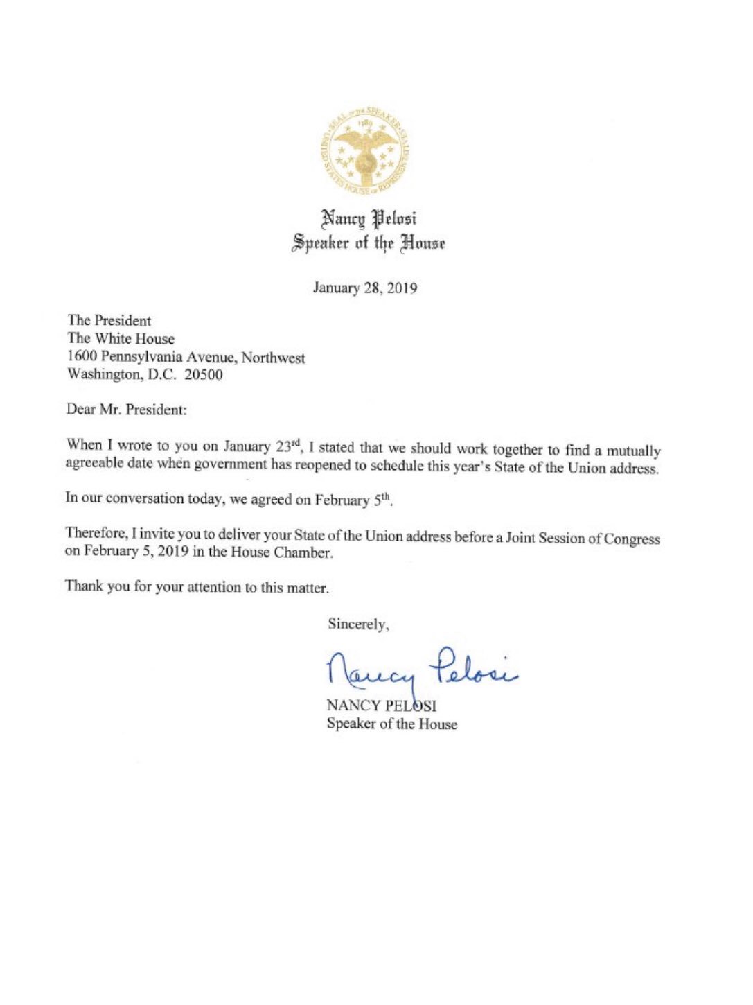 La presidenta de la Cámara de Representantes de EE.UU., Nancy Pelosi, ha invitado en una carta al presidente estadounidense, Donald Trump, a pronunciar el discurso del Estado de la Unión el 5 de febrero antes de la sesión conjunta del Congreso. El mandatario aceptó la invitación.