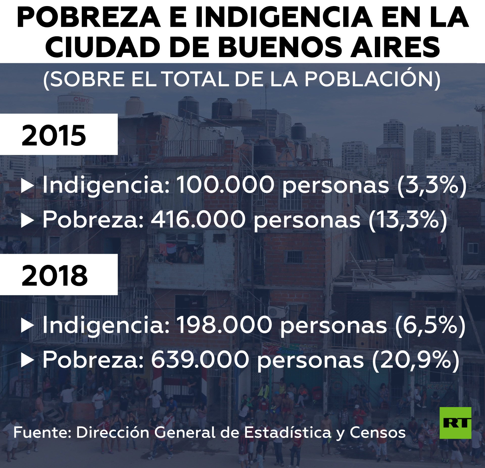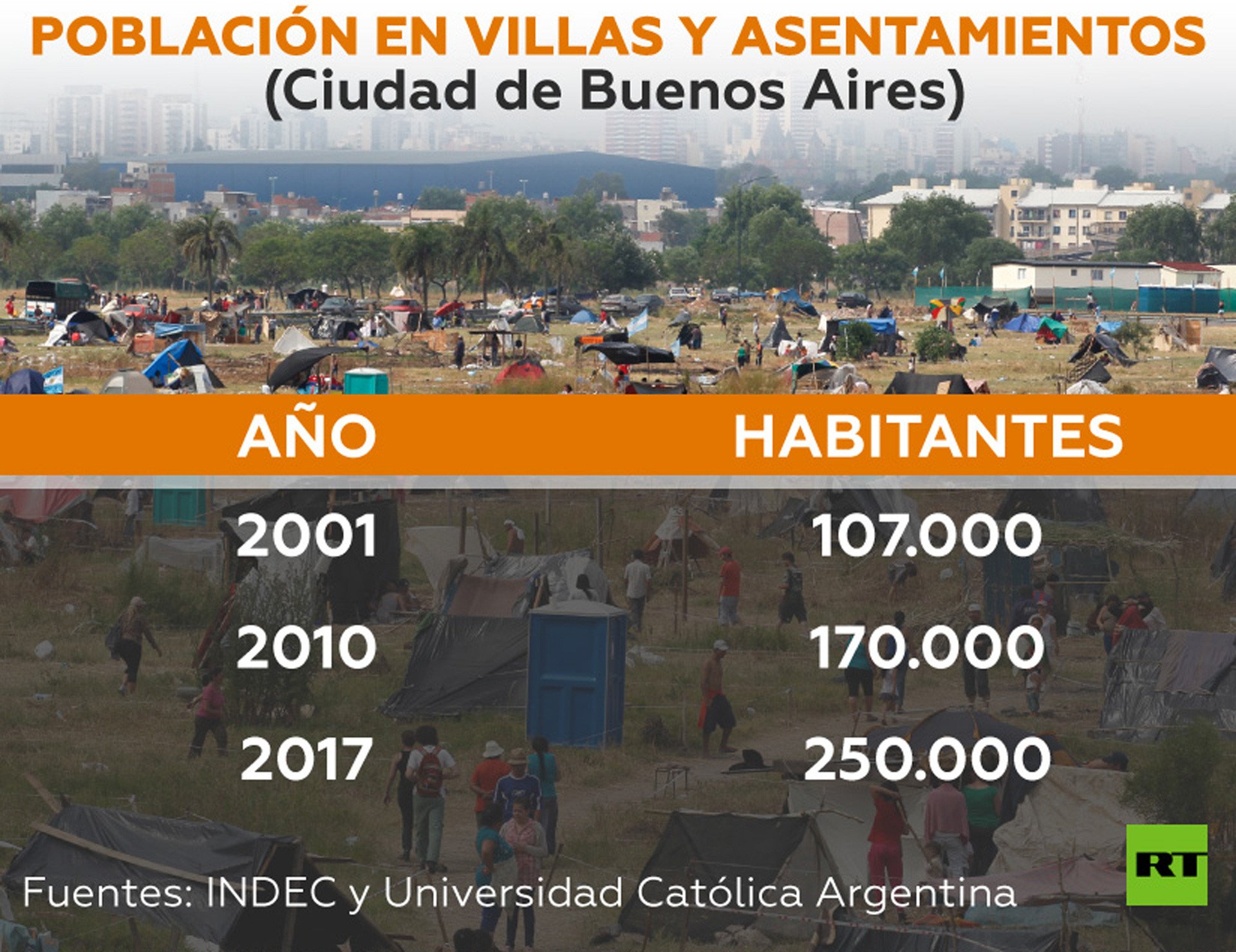 Esto es avalado por las estadísticas públicas que, tomando en cuenta los últimos censos nacionales muestran que en 2001 había 107.000 habitantes en barrios precarios, mientras que en 2010 esa cifra se había elevado a 170.000. Por su parte, una investigación de la Universidad Católica Argentina en conjunto con la Defensoría del Pueblo de la Ciudad de 2017 establecía en alrededor de 250.000 las personas que vivían en este tipo de asentamientos.
