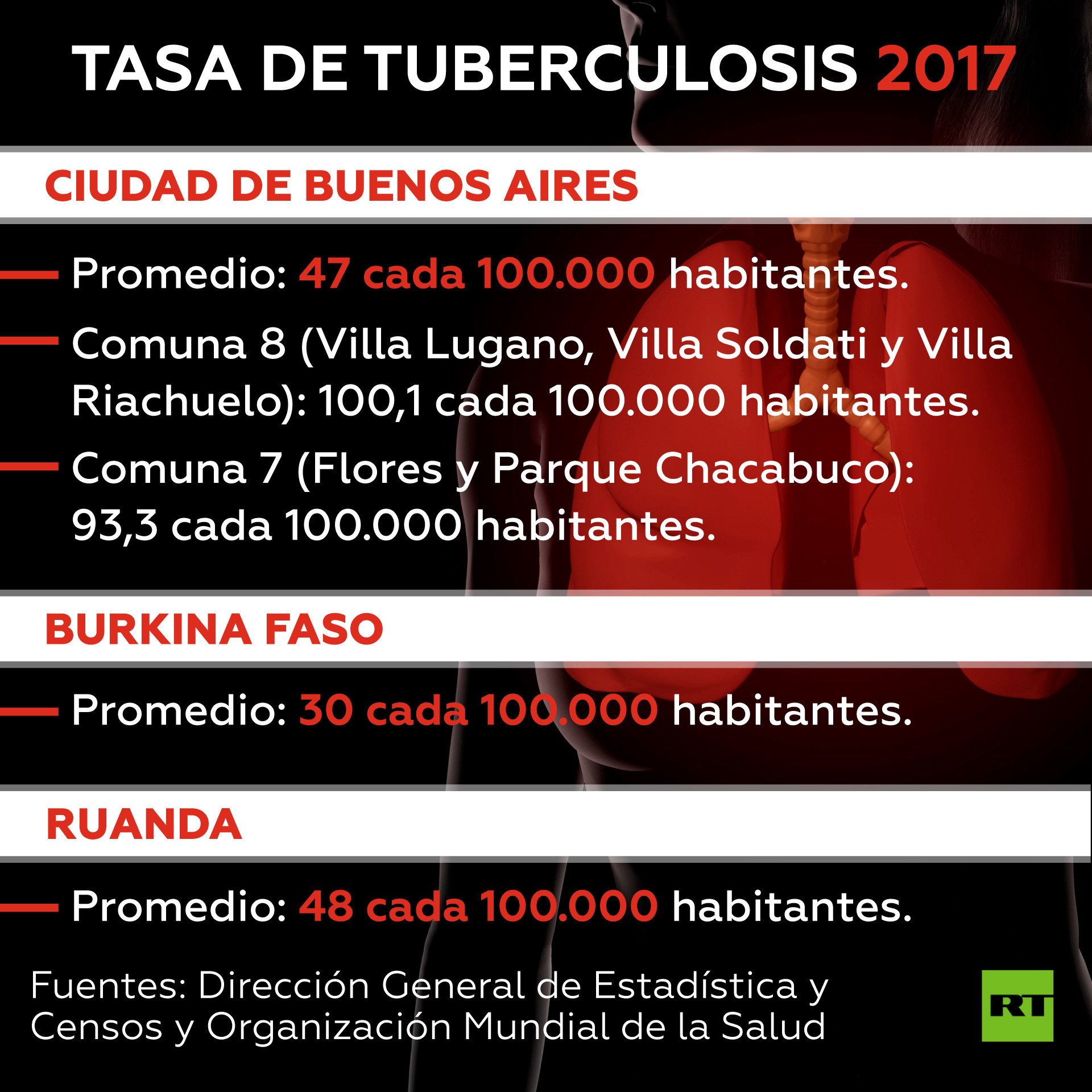 A modo comparativo, según datos de la Organización Mundial de la Salud, la tasa de tuberculosis en Burkina Faso durante 2017 fue de apenas 30 por cada 100.000 habitantes y en Ruanda de 48, es decir, similar al promedio de la ciudad pero muy por debajo de los barrios del sur.