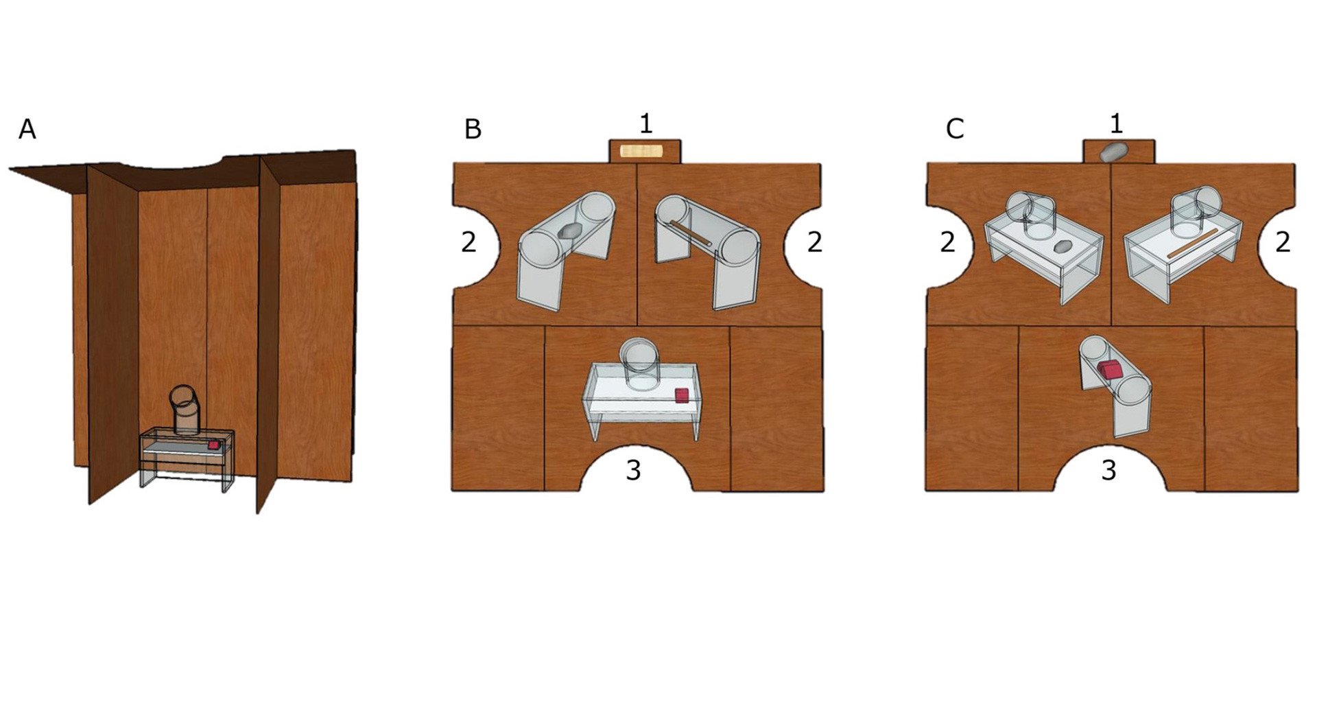 Los cuervos fueron situados ante distintos problemas a solventar, que consistían en distintos aparatos separados entre sí pero interconectados, con la finalidad de que con un palo pequeño o con una piedra el cuervo adivinase el razonamiento a seguir para obtener la recompensa final (un trozo de comida).