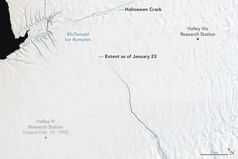 Para llegar a esta conclusión, la agencia espacial comparó imágenes de una misma área obtenidas por los satélites Landsat el 30 de enero de 1986 y el 23 de enero de 2019. En la imagen más reciente se observa cómo una grieta que apareció en octubre de 2016 —la llamada grieta de Halloween— continúa creciendo desde la zona denominada McDonald Ice Rumples y hacia el este.