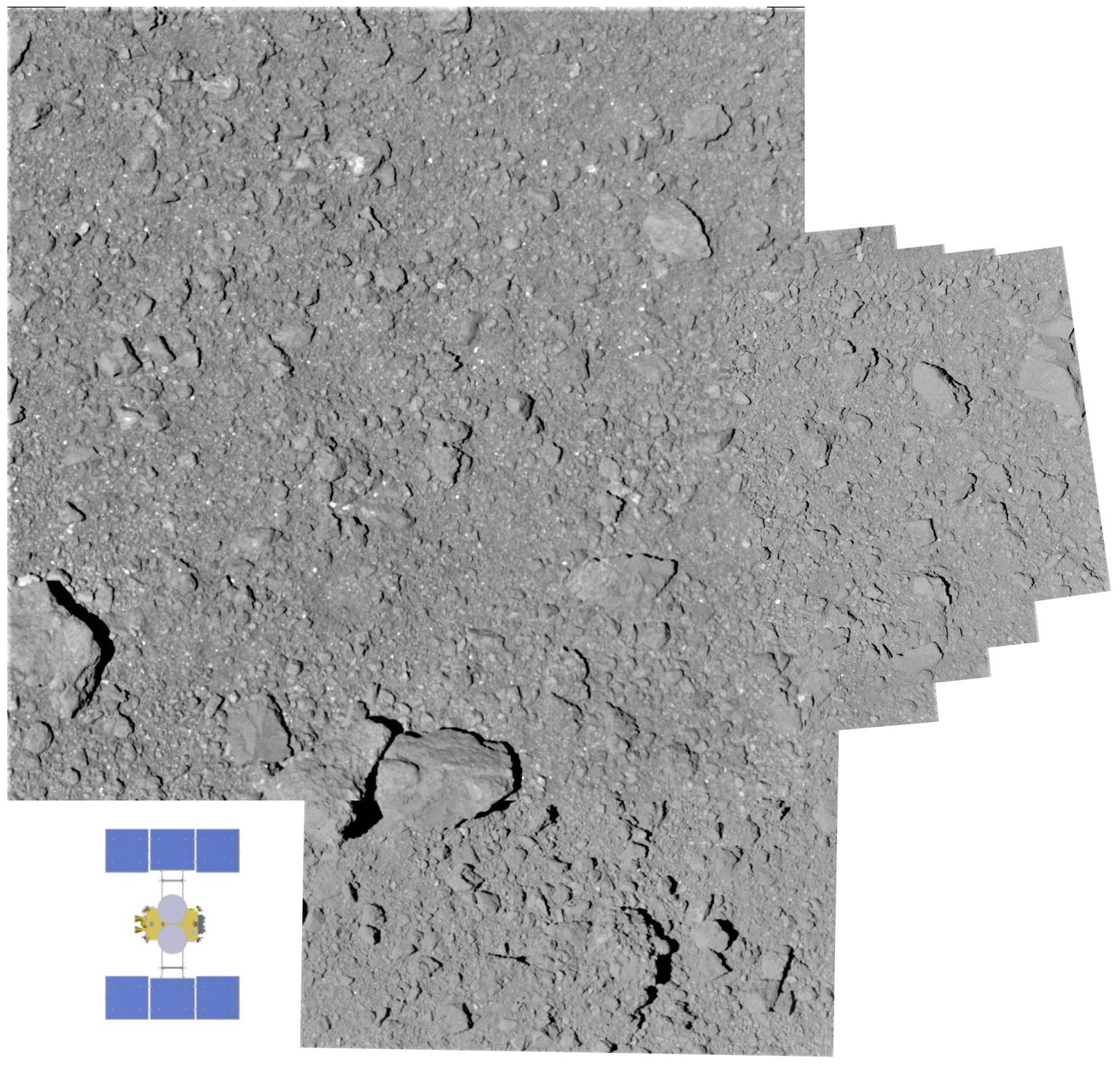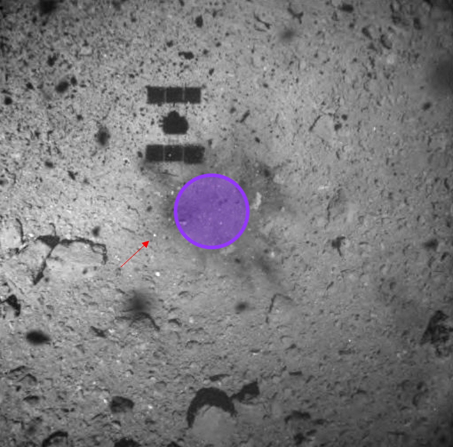 Una de las imágenes difundidas fue tomada a una altura aproximada de 25 metros cerca de un minuto después del aterrizaje. La publicación muestra que el color de la parte de la superficie de Ryugu donde se posó la nave "es diferente del entorno y quedó decolorada por el aterrizaje". "Por el momento, la razón de la decoloración se desconoce, pero quizás se deba a la arena que fue expelida hacia arriba por los propulsores de la nave espacial o por la bala", reza el comunicado emitido por la JAXA.