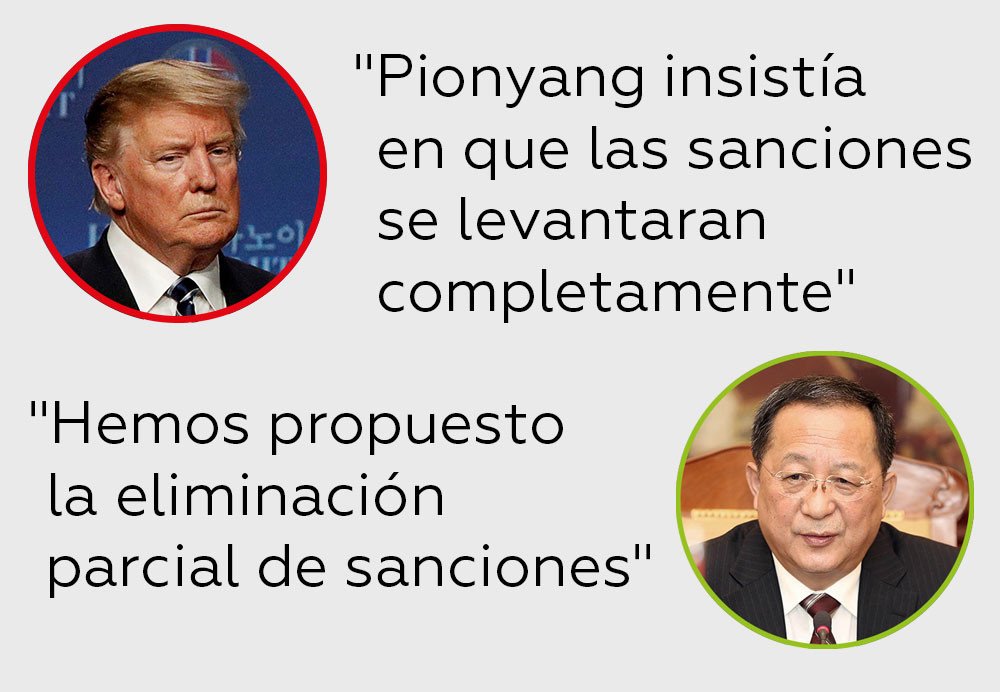 Estas afirmaciones contradicen las palabras de Trump. "Lo que hemos propuesto fue no la eliminación de todas las sanciones, sino una eliminación parcial" de estas, hizo hincapié Ri, añadiendo que el desmantelamiento de Yongbyon era la mejor propuesta posible para avanzar en la desnuclearización en estos momentos.