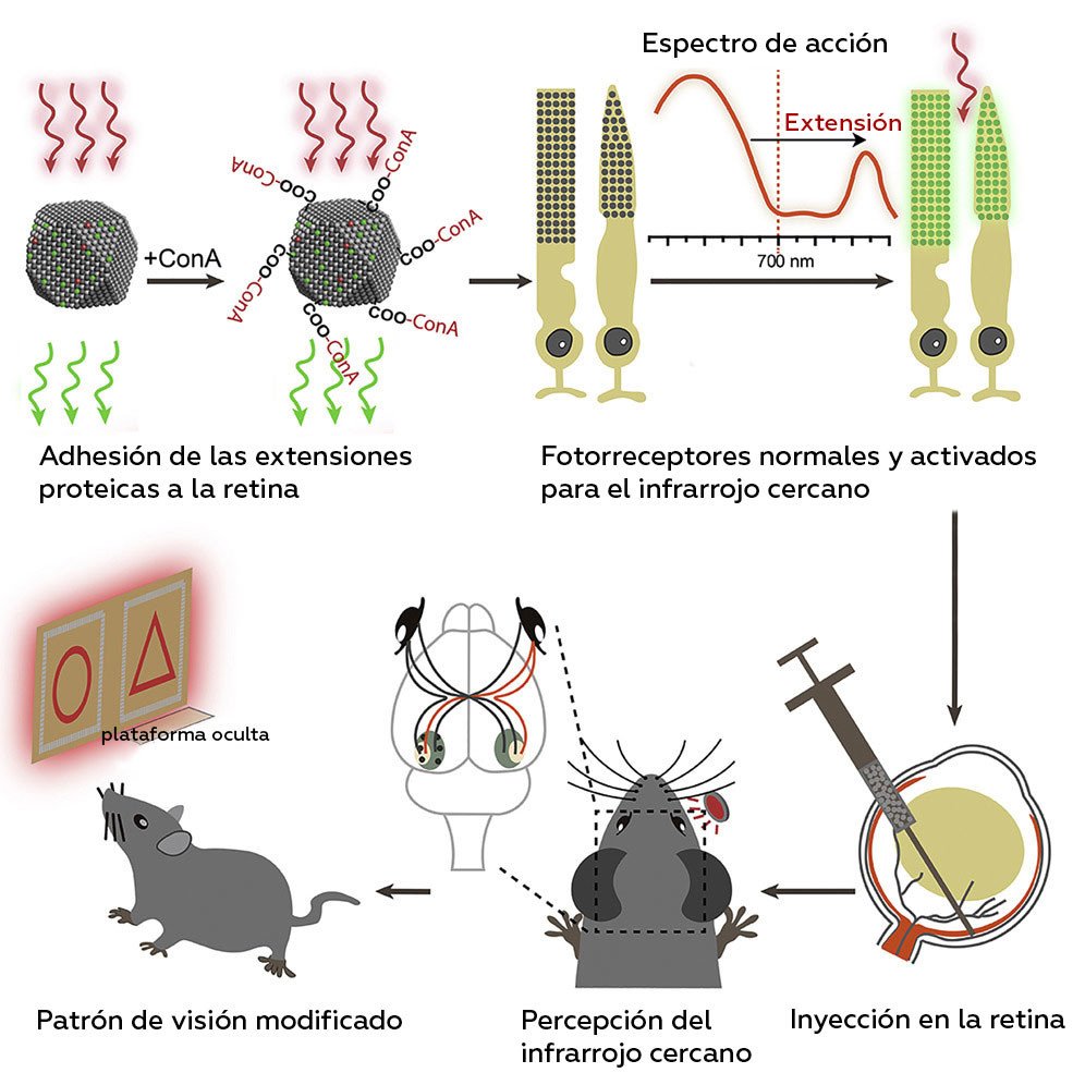 Las gafas de visión nocturna pueden captar esa radiación y convertirla en longitudes de onda que podemos ver, pero esa tecnología resulta incómoda y poco compatible con la luz diurna. De este modo, los científicos chinos han desarrollado "nanopartículas de conversión ascendente" que se adhieren a los fotorreceptores, según explica un artículo que la revista Cell publicó el pasado 28 de febrero.