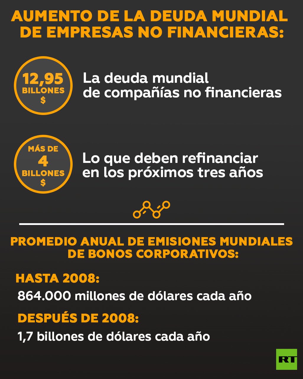Según el informe, las compañías han aumentado sus préstamos en forma de bonos corporativos y entre los años 2008 y 2018 las emisiones mundiales de estos bonos alcanzaron los 1,7 billones de dólares anuales. En comparación, el promedio anual en la década anterior fue de 864.000 millones de dólares.