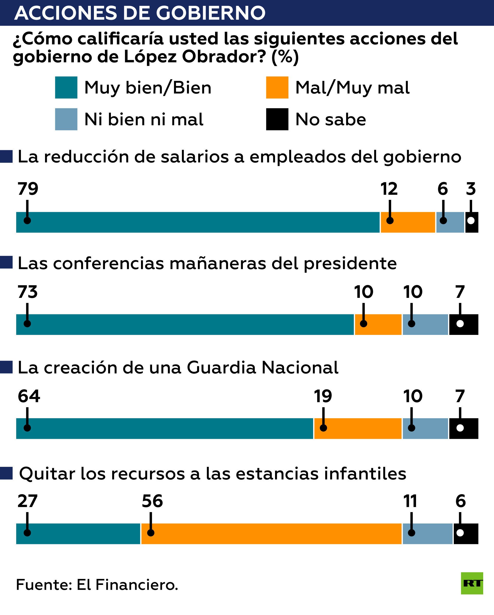 La encuesta también refleja una alta aprobación de los mexicanos hacia las acciones realizadas por López Obrador, incluyendo la creación de la Guardia Nacional, bajar salarios a altos funcionarios públicos y las conferencias de prensa matutinas.