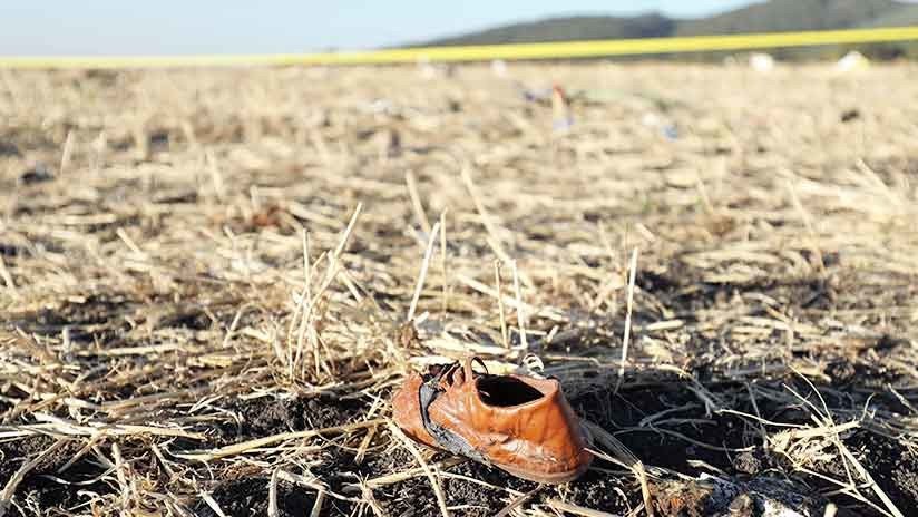 En la imagen se ve cómo un hombre —posiblemente un trabajador de la aerolínea etíope— analiza los restos esparcidos de la aeronave en el lugar de la tragedia.