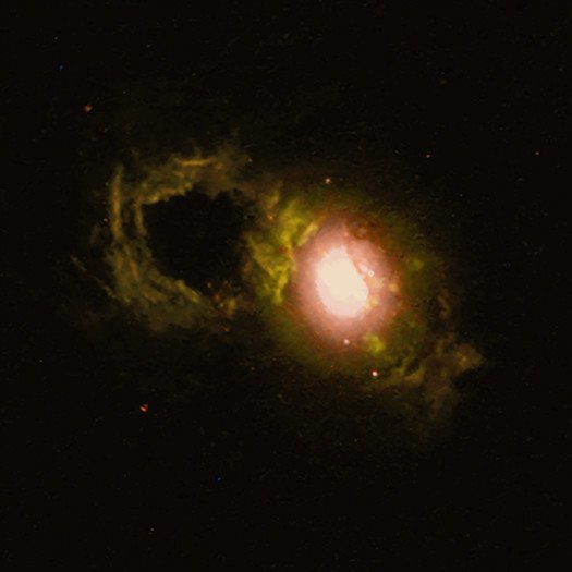 La 'manija' ('asa') de 'la taza de té' en la imagen se encuentra a 30.000 años luz del agujero negro y representa un "anillo de luz óptica y de rayos X alrededor de una burbuja gigante". Los científicos señalan que fue presuntamente formada por las erupciones del agujero negro.