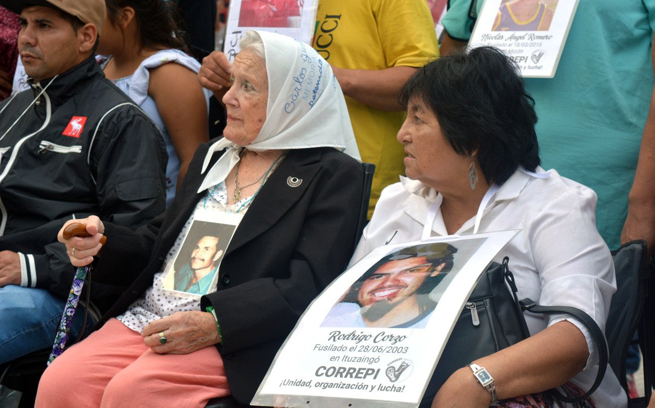Sentada en una silla plástica junto a las decenas de familiares que concurrieron a la presentación del informe de CORREPI, Adriana Rodríguez sostiene en sus manos una foto de su hijo, Ariel Martín Santos. "El 22 de diciembre de 2016, Carla Céspedes, policía de la Ciudad de Buenos Aires, mató a mi hijo de tres tiros por la espalda. Los tres jueces —del Tribunal Oral en lo Criminal (TOC) N° 14—, después de ver las imágenes registradas por las cámaras de seguridad, increíblemente la absolvieron", cuenta. Santos no estaba armado. Tras salir de un supermercado donde robó a un proveedor junto a un cómplice, intentó subirse a una moto para escapar, pero fue ultimado por la oficial de 24 años, quien también fue recibida por la ministra. La familia del joven aguarda la resolución de la Cámara de Apelaciones.