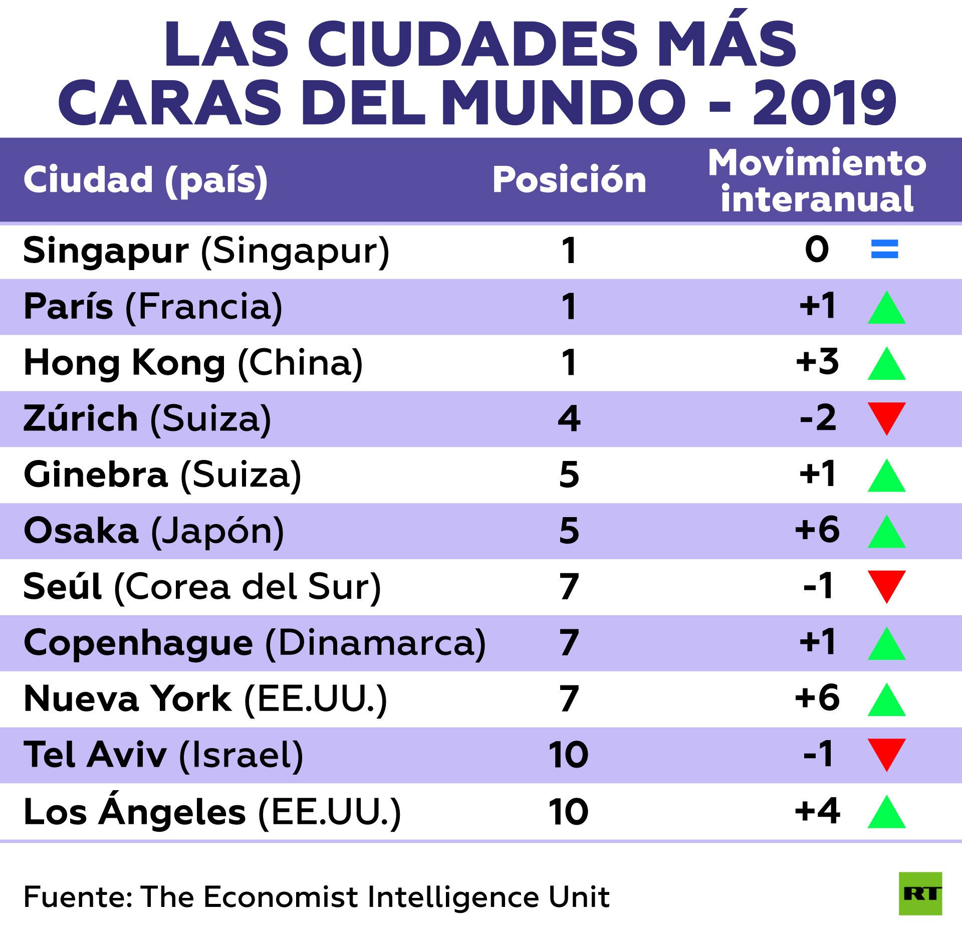 El diario The Economist ha publicado su lista anual de las ciudades más caras del mundo. En esta edición, en la cima de la tabla se ubicaron París (Francia), Hong Kong (China) y Singapur (Singapur), siendo este último el único líder del listado del año anterior.