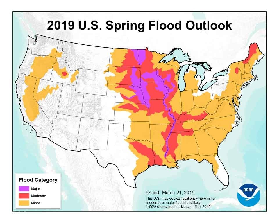 Según se observa en el mapa, los estados que corren mayor riesgo de inundaciones moderadas y generalizadas (ilustradas en el mapa con colores púrpura y rojo) incluyen Minnesota, Iowa, Dakota del Sur y Dakota del Norte, Wisconsin, Nebraska y Missouri. Además, inundaciones menores (amarillas) amenazan a gran parte de los estados al este del río Mississippi, así como a California y Nevada, en la parte occidental de EE.UU.