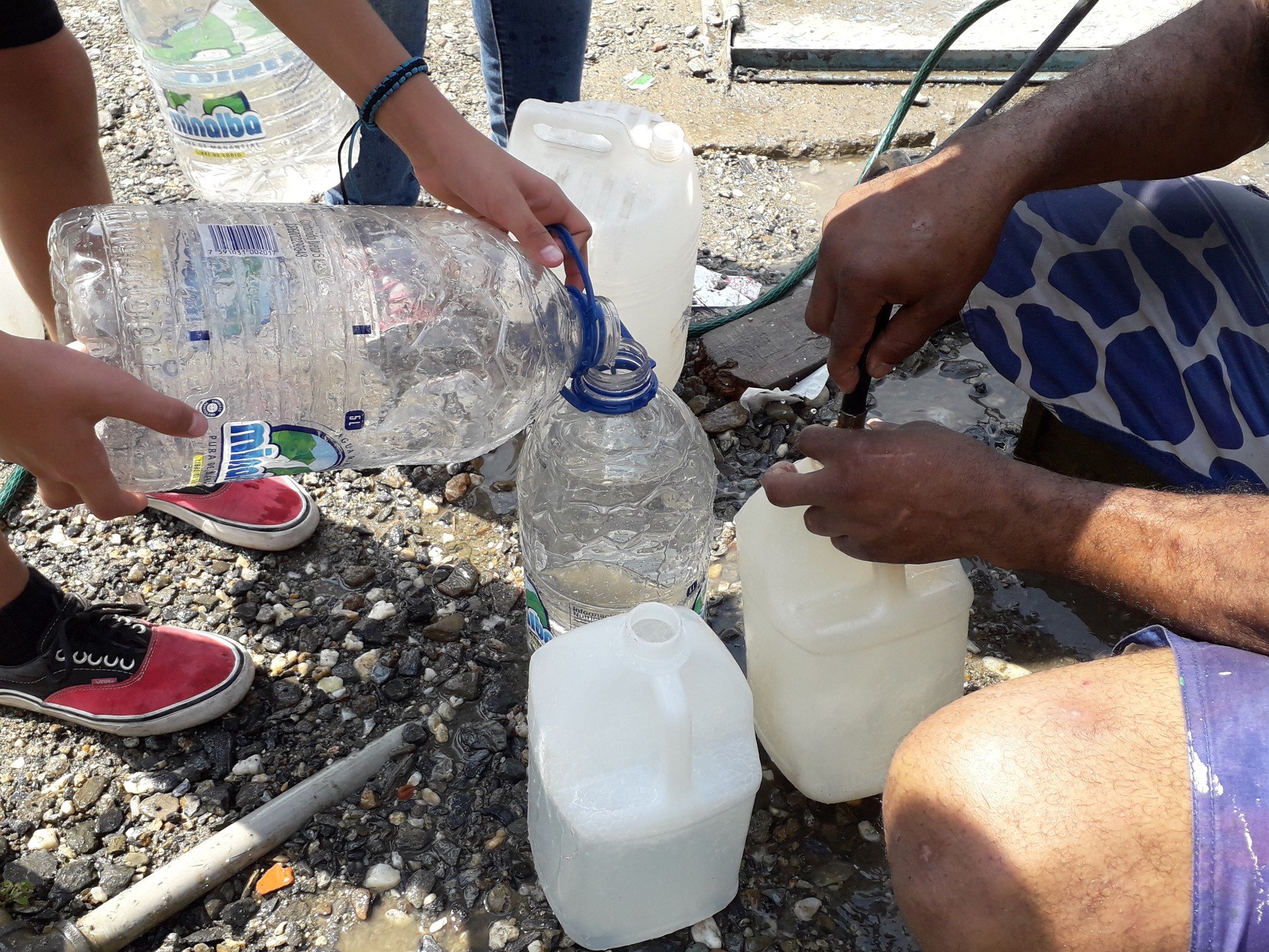Javier González, habitante de la zona popular del 23 de Enero, en el oeste, explica que desde hace tres días colabora voluntariamente con el llenado. Mientras habla sostiene una manguera por donde brota agua de manantial de montaña, que incluso sirve para el consumo.