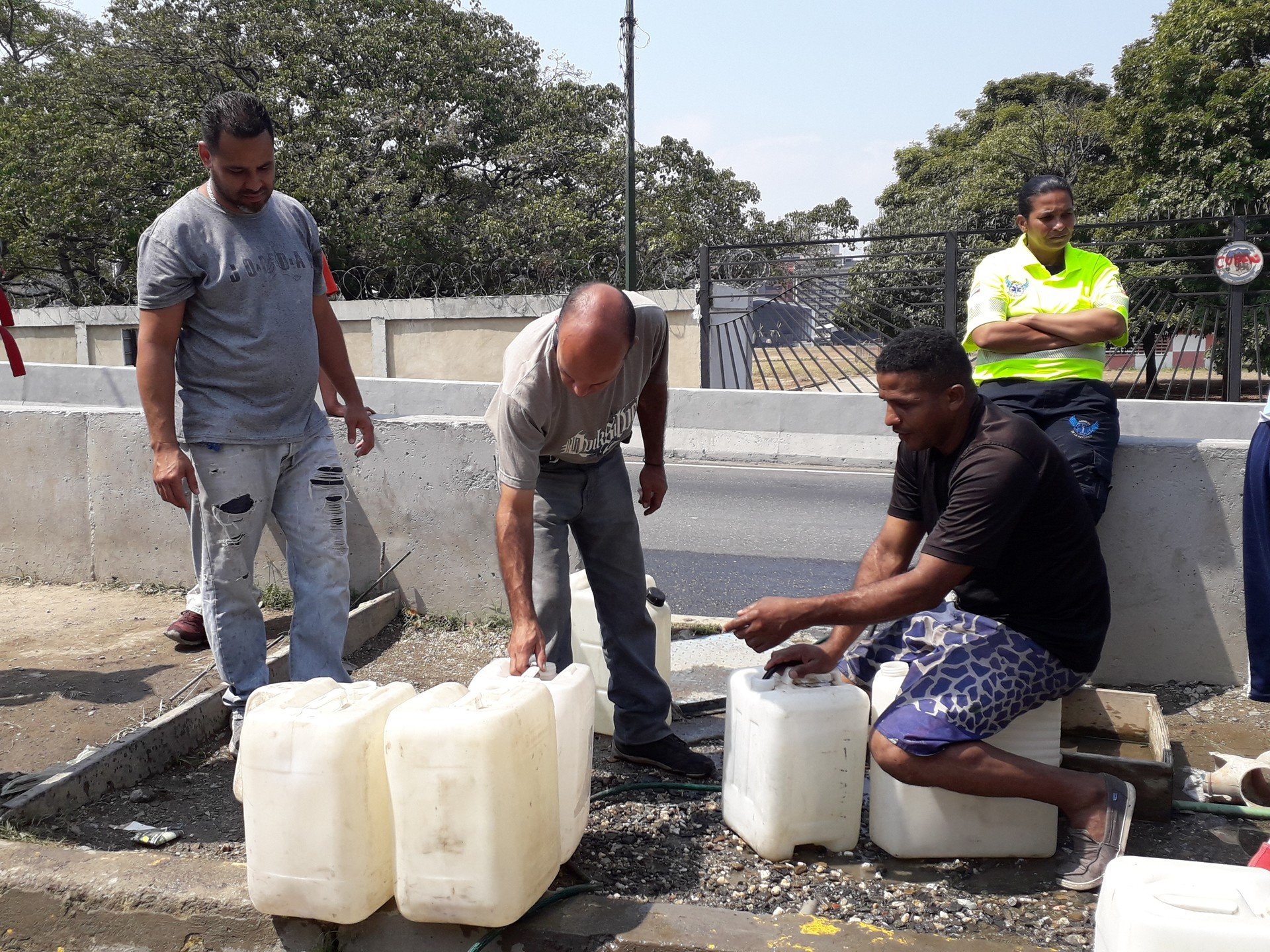 En una toma improvisada en el distribuidor de Altamira, ubicado en la autopista Francisco Fajardo, que conecta el oeste con el este de Caracas, personas esperan su turno para acceder al líquido.