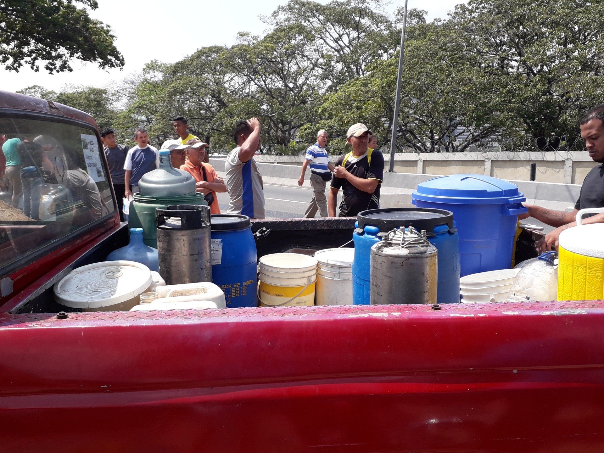 Hace minutos, en la Av Fuerzas Armadas, en Caracas, un grupo de habitantes de la zona llenaban envases de agua de un camión cisterna. Más adelante, otro grupo colocaba trancas en la calle e intentaban impedir la asistencia en el suministro de agua. Reporta @brunosgarzini para #MVpic.twitter.com/X7ModU7Tdi