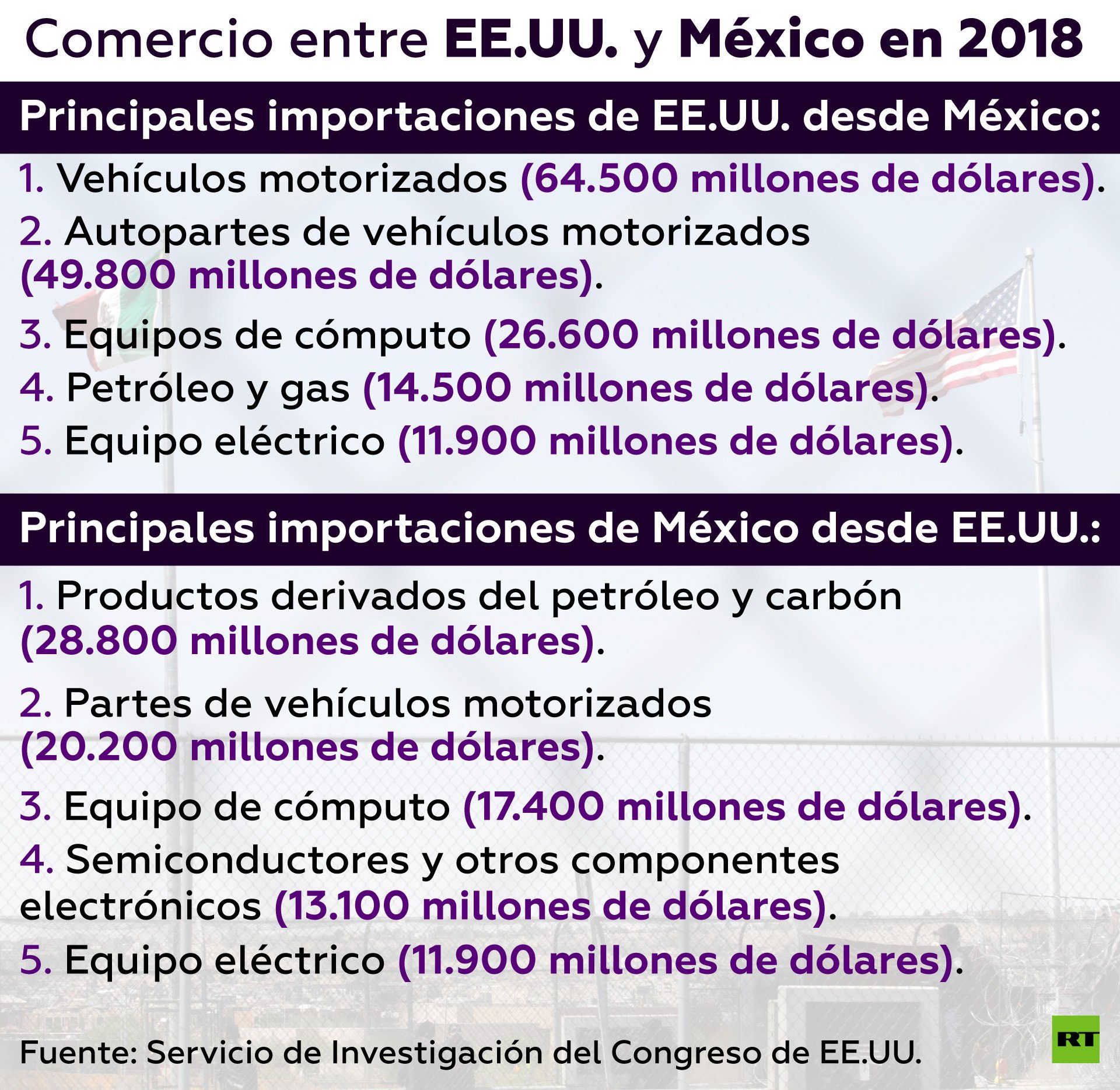 Las principales importaciones estadounidenses de mercancías desde México en 2018, según un reporte reciente del Congreso de EE.UU., fueron: