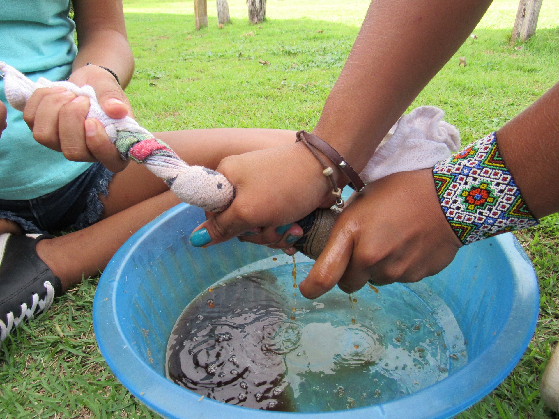 Reunidas en la aldea Curva, tierra indígena Erikibaktsa, estas cuatro indígenas se sientan junto a la orilla del río Juruena para rallar el jenipapo, que después ellas mismas estrujaran para extraer un líquido que se va oscureciendo conforme es manoseado y que, tras un día de reposo, acaba dando lugar a la tinta para las pinturas.