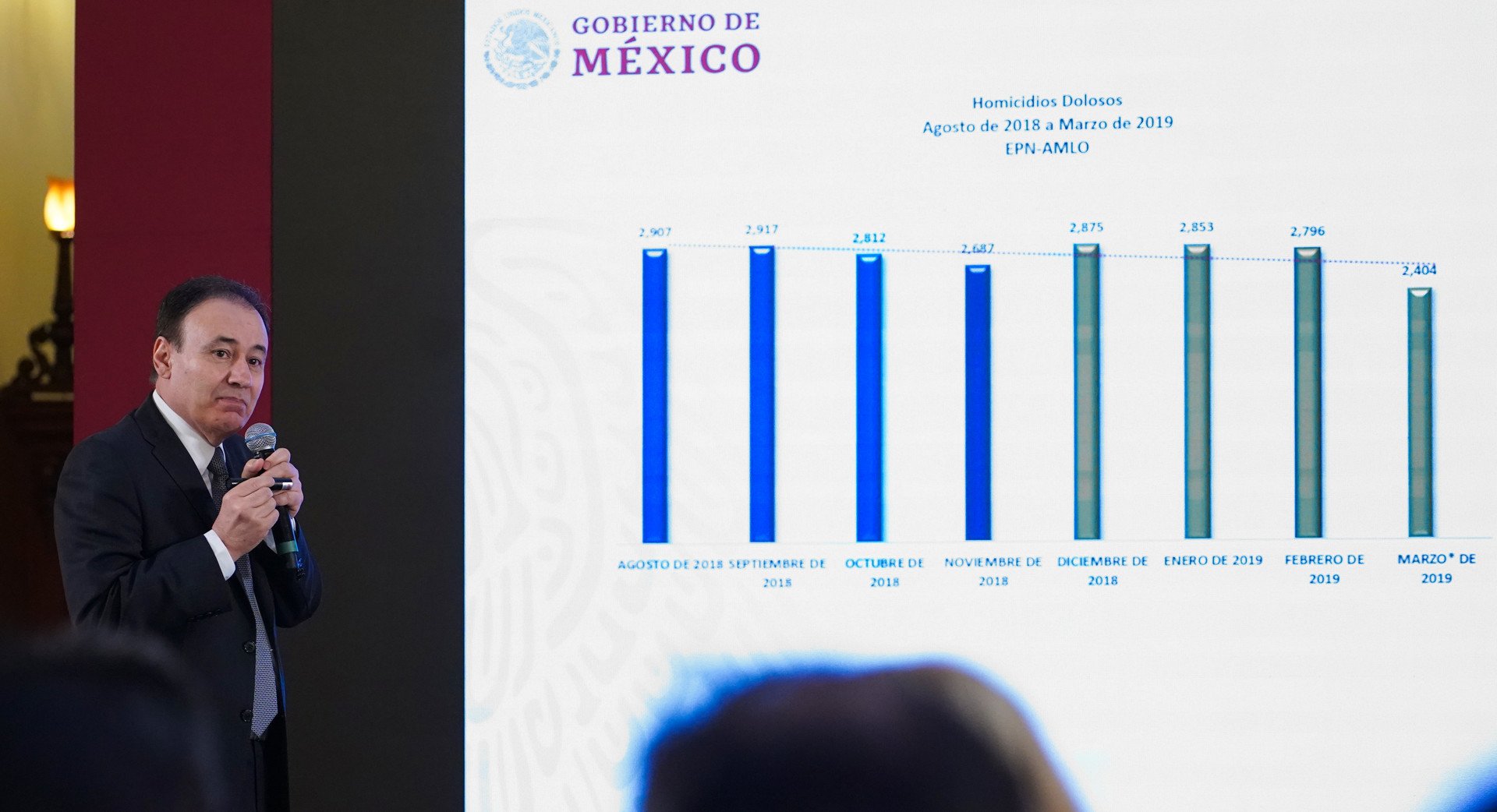 Luego de la conferencia, el SESNSP reporta 2.473 carpetas de investigación por homicidios dolosos en diciembre; 2.452 en enero y 2.374 en febrero.