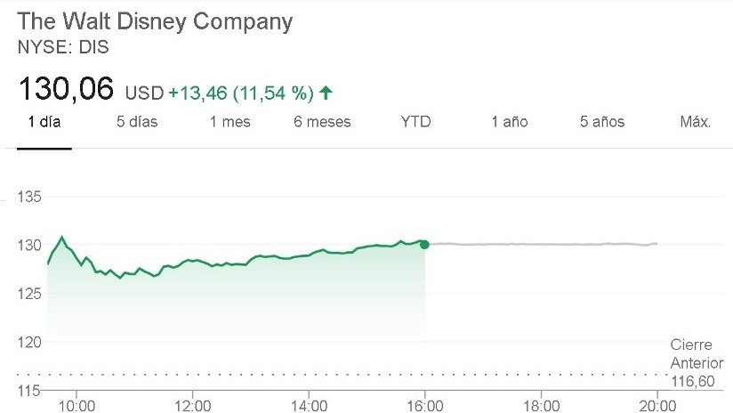 Según los datos de la Bolsa de Nueva York (NYSE), para el cierre de los mercados este viernes, el precio de las acciones de Disney se situó en 130,06 dólares, lo que representa un aumento de 13,46 dólares o el 11,54%. Mientras los valores de Netflix han caído 16,51 dólares (el 4,49%), quedando en 351,14 dólares.