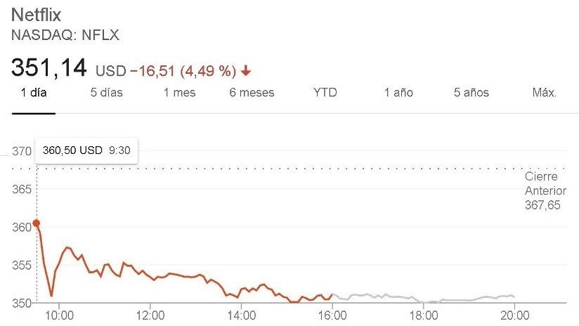 Tras la apertura de negociaciones este viernes, el precio de las acciones de Netflix en unos minutos cayó un 5%, hasta 349,36 dólares por acción, lo que condujo a una disminución de la capitalización de mercado de la compañía hasta 152.500 millones de dólares (para el cierre se situó en 153.310 millones de dólares).