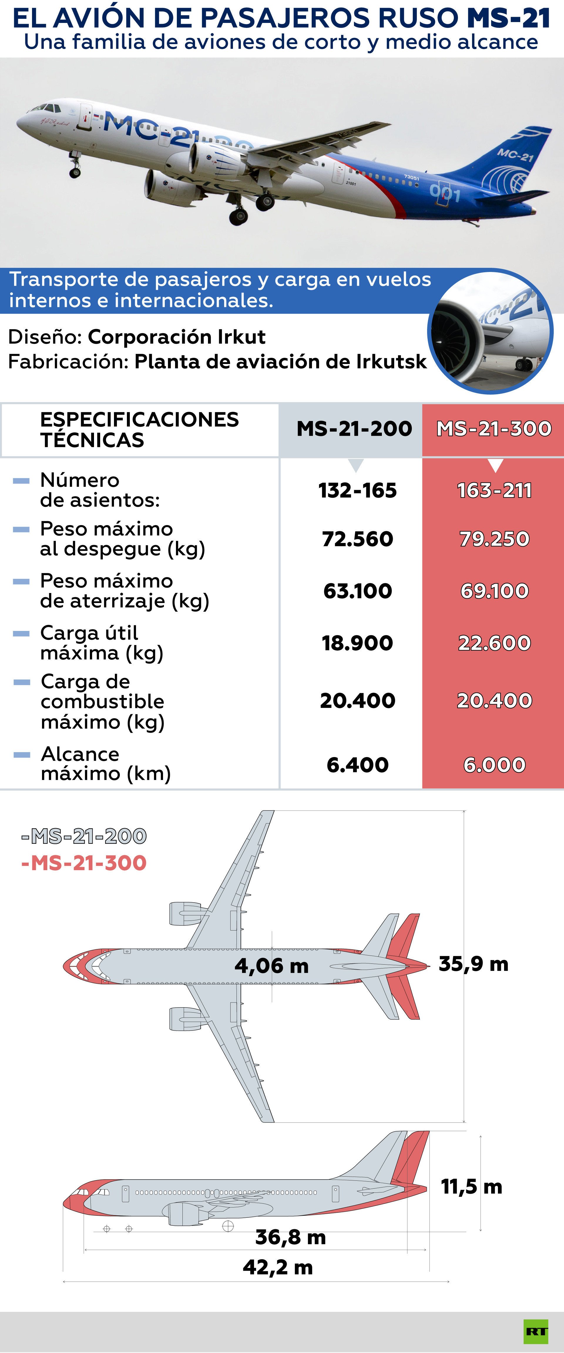 El avión de pasajeros de alcance medio MC-21-300 realizó su vuelo inaugural en mayo de 2017. Está previsto que sea presentado públicamente en el salón internacional aeronáutico ruso MAKS-2019 a finales de este año.