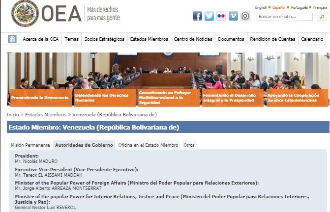 En el portal de la OEA, Tarre aparece como "Embajador designado de la Asamblea Nacional", mientras que en la ficha oficial de Venezuela aún sigue apareciendo Nicolás Maduro como presidente del país caribeño.