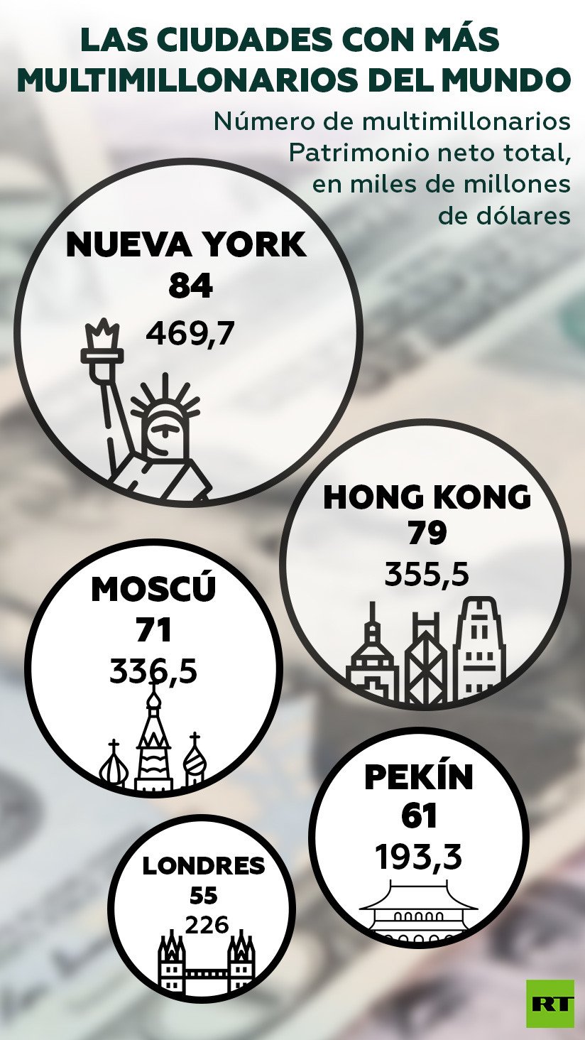 Actualmente, la capital rusa ocupa el tercer lugar en la lista, con 71 multimillonarios que acumulan 336.500 millones de dólares, mientras que la segunda posición la ocupa Hong Kong, donde residen 79 personas cuyo patrimonio neto total asciende a 355.500 millones.