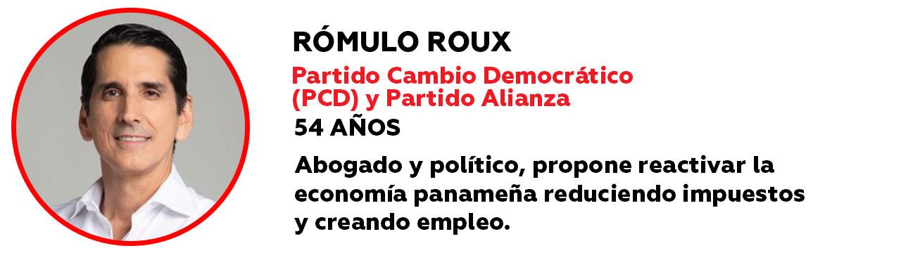 Bajo la promesa de reactivar y transformar la economía, el candidato presidencial del Partido Cambio Democrático (PCD) y el Partido Alianza, Rómulo Roux, se erige como el principal competidor del PRD, e incluso algunos de los últimos sondeos lo daban con una leve ventaja por encima de Cortizo.